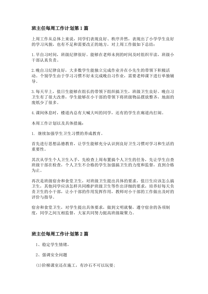 班主任每周工作计划第1篇上周工作从总体上来说,同学们表现良好、秩序井然,表现出了小学学生良好的学习风貌,也有不足和需要改正的地方,对上周工作做如下总结:1.早自习时间,班级纪律很好。能够在老师未到的时间及时组织早读,班级小干部认真负责2.晚自习纪律良好,大多数学生能独立完成作业并在小先生的带领下积极活动。个别学生由于学习习惯不好未完成晚自习作业,需要老师课下进行单独辅导。3每天早上,值日生能够在组长的带领下组织搞卫生,班级卫生良好。晚自习卫生有了很大改善,学生能够在小干部的带领下将班级物品摆放整齐,地面的废纸少了很多。4.课间休息时,楼道内总有大喊大叫的同学,还有的学生在廊道内打闹。本周工作计划以及具体措施:1.继续加强学生卫生习惯的养成教育。首先进行思想品德教育,让学生能够充分认识到良好卫生习惯对学习和生活的重要性。其次从学生个人卫生入手,先检查上周布置犒个人卫生的任务,先让学生自查班级干部在检查,个人卫生不合格的学生加强搞卫生的力度和监督,直到合格为止。再次是班级宿舍和食堂卫生,对班级卫生提出具体的要求,值日生应该怎么搞卫生,其他同学应该怎样共同维护班级卫生等作出详细的要求,培养好每天负责卫生的小干部,让小干部的作用发挥作用,教师对小干部的工作做出及时的评价与指导。宿舍和食堂卫生,对学生提出具体要求,做到文明就餐,遵守宿舍的各项制度,同学之间互相监督,大家共同努力挺高班级凝聚力。班主任每周工作计划第2篇1、稳定学生情绪,2、强调安全问题(1)阶梯课室还在施工,有沙石不可以玩耍: