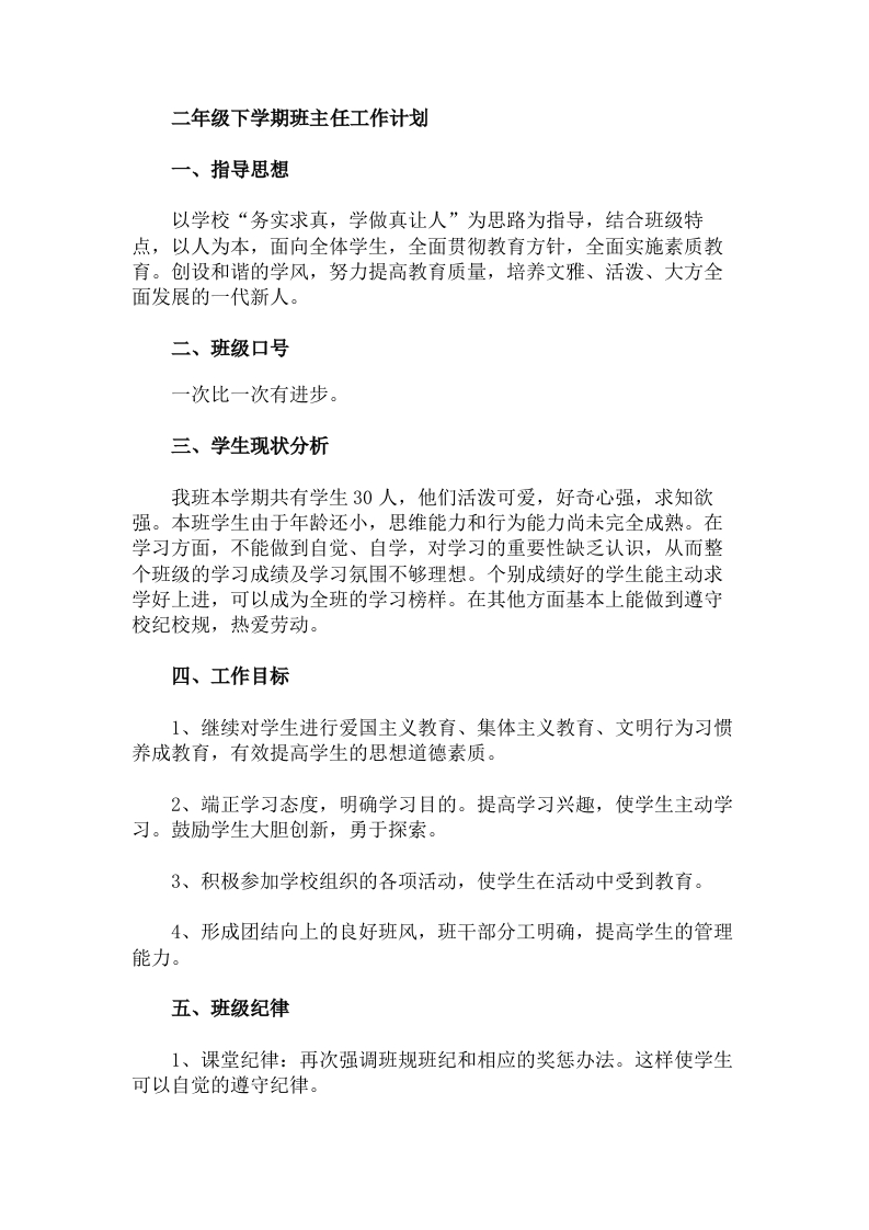 二年级下学期班主任工作计划一、指导思想以学校“务实求真,学做真让人”为思路为指导,结合班级特点,以人为本,面向全体学生,全面贯彻教育方针,全面实施素质教育。创设和谐的学风,努力提高教育质量,培养文雅、活泼、大方全面发展的一代新人。二、班级口号一次比一次有进步。三、学生现状分析我班本学期共有学生30人,他们活泼可爱,好奇心强,求知欲强。本班学生由于年龄还小,思维能力和行为能力尚未完全成熟。在学习方面,不能做到自觉、自学,对学习的重要性缺乏认识,从而整个班级的学习成绩及学习氛围不够理想。个别成绩好的学生能主动求学好上进,可以成为全班的学习榜样。在其他方面基本上能做到遵守校纪校规,热爱劳动。四、工作目标1、继续对学生进行爱国主义教育、集体主义教育、文明行为习惯养成教育,有效提高学生的思想道德素质。2、端正学习态度,明确学习目的。提高学习兴趣,使学生主动学习。鼓励学生大胆创新,勇于探索。3、积极参加学校组织的各项活动,使学生在活动中受到教育。4、形成团结向上的良好班风,班干部分工明确,提高学生的管理能力。五、班级纪律1、课堂纪律:再次强调班规班纪和相应的奖惩办法。这样使学生可以自觉的遵守纪律。