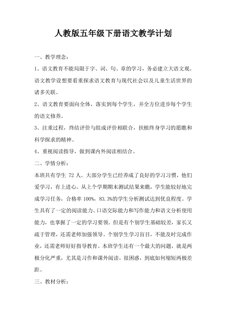 人教版五年级下册语文教学计划一、教学理念:1、语文教育不能局限于字、词、句、章的学习,务必建立大语文观。语文教学设想要看重探求语文教育与现代社会以及儿童生活世界的诸多关联。2、语文教育要面向全体,落实到每个学生,并全方位进步每个学生的语文修养。3、注重过程,终结评价与组成评价相联合,扶植终身学习的愿瞧和科学探求的精神。4、重视阅读指导,做到课内外阅读相结合。二、学情分析:本班共有学生72人。大部分学生已经养成了良好的学习习惯,他们爱学习,有上进心。从上个学期期末测试结果来瞧,学生能较好地完成学习任务,合格率100%,83.3%的学生分析测试达到优良程度。学生具有了一定的阅读能力、口语交际能力和写作能力和语文分析使用能力,也掌握了一定的学习要领。但是有个别学生基础较差,家长又疏于管理,还需老师加强领导。个别学生学习盲目,不能及时完成作业,还需老师好好指导教育。本班学生还有一个最大的问题,就是两极分化严重,尤其是习作和课外阅读,很困惑,到底如何缩短两极差距。三、教材分析: