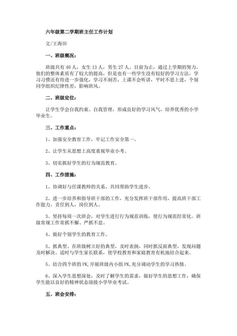 六年级第二学期班主任工作计划文/王海田一、班级概况:班级共有40人,女生13人,男生27人。目前为止,通过上学期的努力,他们的整体素质有了较大的提高,但是也有一些学生没有较好的学习方法,学习习惯还有待进一步强化,学习不刻苦,上课不会听讲,平时不思上进,个别同学组织纪律性差,影响班风。二、班级定位:让学生学会自我约束、自我管理,形成良好的学习风气,培养优秀的小学毕业生。三、工作重点:1、加强安全教育工作,牢记工作安全第一。2、让学生从思想上高度重视毕业小考。3、切实抓好学生的行为规范教育。四、工作措施:1、协调好与任课教师的关系,共同帮助学生进步。2、进一步培养和指导班干部的工作,充分发挥班干部作用,提高班干部工作能力。责任到人,岗位到人。3、坚持每周一次班会,对学生进行行为规范训练,使行为规范经常化。班级常规工作常抓不懈、严抓不怠。4、做好个别学生的教育工作。5、抓典型。在班级树立好的典型,及时表扬,同时抓反面典型,发现问题及时解决。适时与学生家长联系,使学校教育和家庭教育有机地结合起来。5、结合四个班的PK,开展班级内小组PK,充分调动学生的学习热情。6、深入学生思想深处,及时了解学生的需求,做好学生的思想工作,确保学生能以良好的精神状态迎接小学毕业考试。五、班会安排: