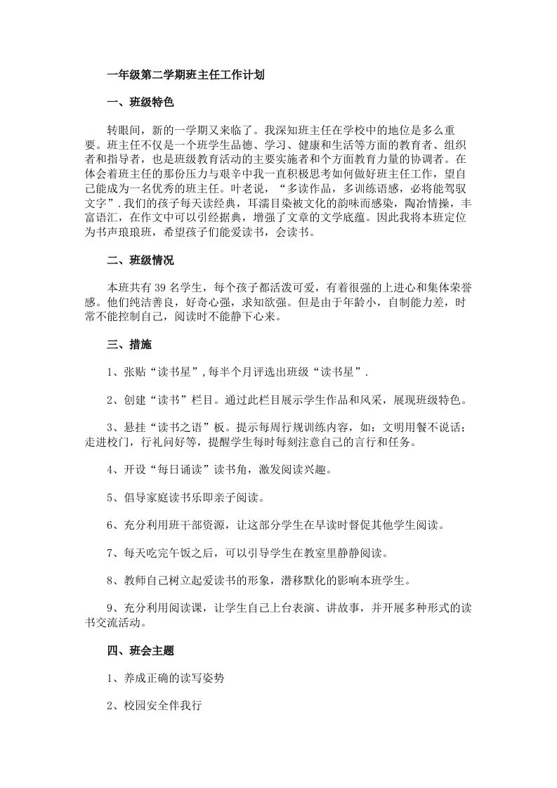 一年级第二学期班主任工作计划一、班级特色转眼间,新的一学期又来临了。我深知班主任在学校中的地位是多么重要。班主任不仅是一个班学生品德、学习、健康和生活等方面的教育者、组织者和指导者,也是班级教育活动的主要实施者和个方面教育力量的协调者。在体会着班主任的那份压力与艰辛中我一直积极思考如何做好班主任工作,望自己能成为一名优秀的班主任。叶老说,“多读作品,多训练语感,必将能驾驭文字”.我们的孩子每天读经典,耳濡目染被文化的韵味而感染,陶治情操,丰富语汇,在作文中可以引经据典,增强了文章的文学底蕴。因此我将本班定位为书声琅琅班,希望孩子们能爱读书,会读书。二、班级情况本班共有39名学生,每个孩子都活泼可爱,有着很强的上进心和集体荣誉感。他们纯洁善良,好奇心强,求知欲强。但是由于年龄小,自制能力差,时常不能控制自己,阅读时不能静下心来。三、措施1、张贴“读书星”,每半个月评选出班级“读书星”2、创建“读书”栏目。通过此栏目展示学生作品和风采,展现班级特色。3、悬挂“读书之语”板。提示每周行规训练内容,如:文明用餐不说话:走进校门,行礼问好等,提醒学生每时每刻注意自己的言行和任务。4、开设“每日诵读”读书角,激发阅读兴趣。5、倡导家庭读书乐即亲子阅读6、充分利用班干部资源,让这部分学生在早读时督促其他学生阅读。7、每天吃完午饭之后,可以引导学生在教室里静静阅读。8、教师自己树立起爱读书的形象,潜移默化的影响本班学生。9、充分利用阅读课,让学生自己上台表演、讲故事,并开展多种形式的读书交流活动。四、班会主题1、养成正确的读写姿势2、校园安全伴我行