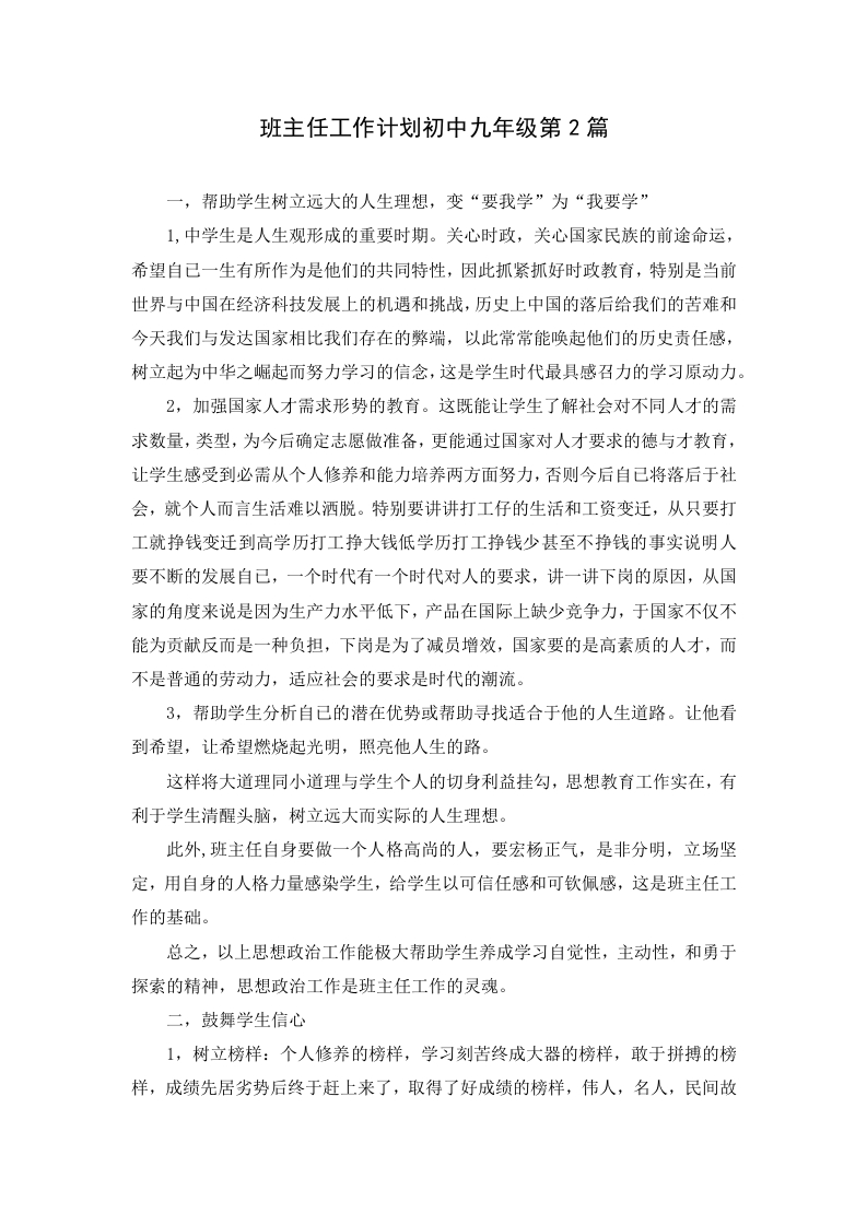 班主任工作计划初中九年级第2篇一,帮助学生树立远大的人生理想,变“要我学”为“我要学”1,中学生是人生观形成的重要时期。关心时政,关心国家民族的前途命运,希望自已一生有所作为是他们的共同特性,因此抓紧抓好时政教育,特别是当前世界与中国在经济科技发展上的机遇和挑战,历史上中国的落后给我们的苦难和今天我们与发达国家相比我们存在的弊端,以此常常能唤起他们的历史责任感,树立起为中华之崛起而努力学习的信念,这是学生时代最具感召力的学习原动力。2,加强国家人才需求形势的教育。这既能让学生了解社会对不同人才的需求数量,类型,为今后确定志愿做准备,更能通过国家对人才要求的德与才教育,让学生感受到必需从个人修养和能力培养两方面努力,否则今后自已将落后于社会,就个人而言生活难以洒脱。特别要讲讲打工仔的生活和工资变迁,从只要打工就挣钱变迁到高学历打工挣大钱低学历打工挣钱少甚至不挣钱的事实说明人要不断的发展自已,一个时代有一个时代对人的要求,讲一讲下岗的原因,从国家的角度来说是因为生产力水平低下,产品在国际上缺少竞争力,于国家不仅不能为贡献反而是一种负担,下岗是为了减员增效,国家要的是高素质的人才,而不是普通的劳动力,适应社会的要求是时代的潮流。3,帮助学生分析自已的潜在优势或帮助寻找适合于他的人生道路。让他看到希望,让希望燃烧起光明,照亮他人生的路。这样将大道理同小道理与学生个人的切身利益挂勾,思想教育工作实在,有利于学生清醒头脑,树立远大而实际的人生理想。此外,班主任自身要做一个人格高尚的人,要宏杨正气,是非分明,立场坚定,用自身的人格力量感染学生,给学生以可信任感和可软佩感,这是班主任工作的基础。总之,以上思想政治工作能极大帮助学生养成学习自觉性,主动性,和勇于探索的精神,思想政治工作是班主任工作的灵魂。二,鼓舞学生信心1,树立榜样:个人修养的榜样,学习刻苦终成大器的榜样,敢于拼搏的榜样,成绩先居劣势后终于赶上来了,取得了好成绩的榜样,伟人,名人,民间故