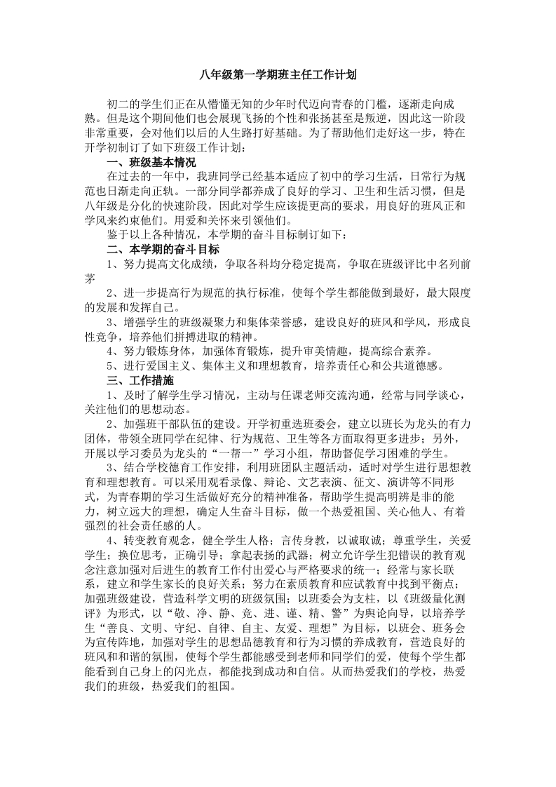 八年级第一学期班主任工作计划初二的学生们正在从懵懂无知的少年时代迈向青春的门槛,逐渐走向成熟。但是这个期间他们也会展现飞扬的个性和张扬甚至是叛逆,因此这一阶段非常重要,会对他们以后的人生路打好基础。为了帮助他们走好这一步,特在开学初制订了如下班级工作计划:、班级基本情况在过去的一年中,我班同学已经基本适应了初中的学习生活,日常行为规范也日渐走向正轨。一部分同学都养成了良好的学习、卫生和生活习惯,但是八年级是分化的快速阶段,因此对学生应该提更高的要求,用良好的班风正和学风来约束他们。用爱和关怀来引领他们。鉴于以上各种情况,本学期的奋斗目标制订如下:二、本学期的奋斗目标1、努力提高文化成绩,争取各科均分稳定提高,争取在班级评比中名列前茅2、进一步提高行为规范的执行标准,使每个学生都能做到最好,最大限度的发展和发挥自己。3、增强学生的班级凝聚力和集体荣誉感,建设良好的班风和学风,形成良性竞争,培养他们拼搏进取的精神。4、努力锻炼身体,加强体育锻炼,提升审美情趣,提高综合素养。5、进行爱国主义、集体主义和理想教育,培养责任心和公共道德感。三、工作措施1、及时了解学生学习情况,主动与任课老师交流沟通,经常与同学谈心,关注他们的思想动态。2、加强班干部队伍的建设。开学初重选班委会,建立以班长为龙头的有力团体,带领全班同学在纪律、行为规范、卫生等各方面取得更多进步:另外,开展以学习委员为龙头的“一帮一”学习小组,帮助督促学习困难的学生。3、结合学校德育工作安排,利用班团队主题活动,适时对学生进行思想教育和理想教育。可以采用观看录像、辩论、文艺表演、征文、演讲等不同形式,为青春期的学习生活做好充分的精神准备,帮助学生提高明辨是非的能力,树立远大的理想,确定人生奋斗目标,做一个热爱祖国、关心他人、有着强烈的社会责任感的人。4、转变教育观念,健全学生人格:言传身教,以诚取诚:尊重学生,关爱学生:换位思考,正确引导:拿起表扬的武器:树立允许学生犯错误的教育观念注意加强对后进生的教育工作付出爱心与严格要求的统一;经常与家长联系,建立和学生家长的良好关系:努力在素质教育和应试教育中找到平衡点:加强班级建设,营造科学文明的班级氛围:以班委会为支柱,以《班级量化测评》为形式,以“敬、净、静、竞、进、谨、精、警”为舆论向导,以培养学生“善良、文明、守纪、自律、自主、友爱、理想”为目标,以班会、班务会为宣传阵地,加强对学生的思想品德教育和行为习惯的养成教育,营造良好的班风和和谐的氛围,使每个学生都能感受到老师和同学们的爱,使每个学生都能看到自己身上的闪光点,都能找到成功和自信。从而热爱我们的学校,热爱我们的班级,热爱我们的祖国。