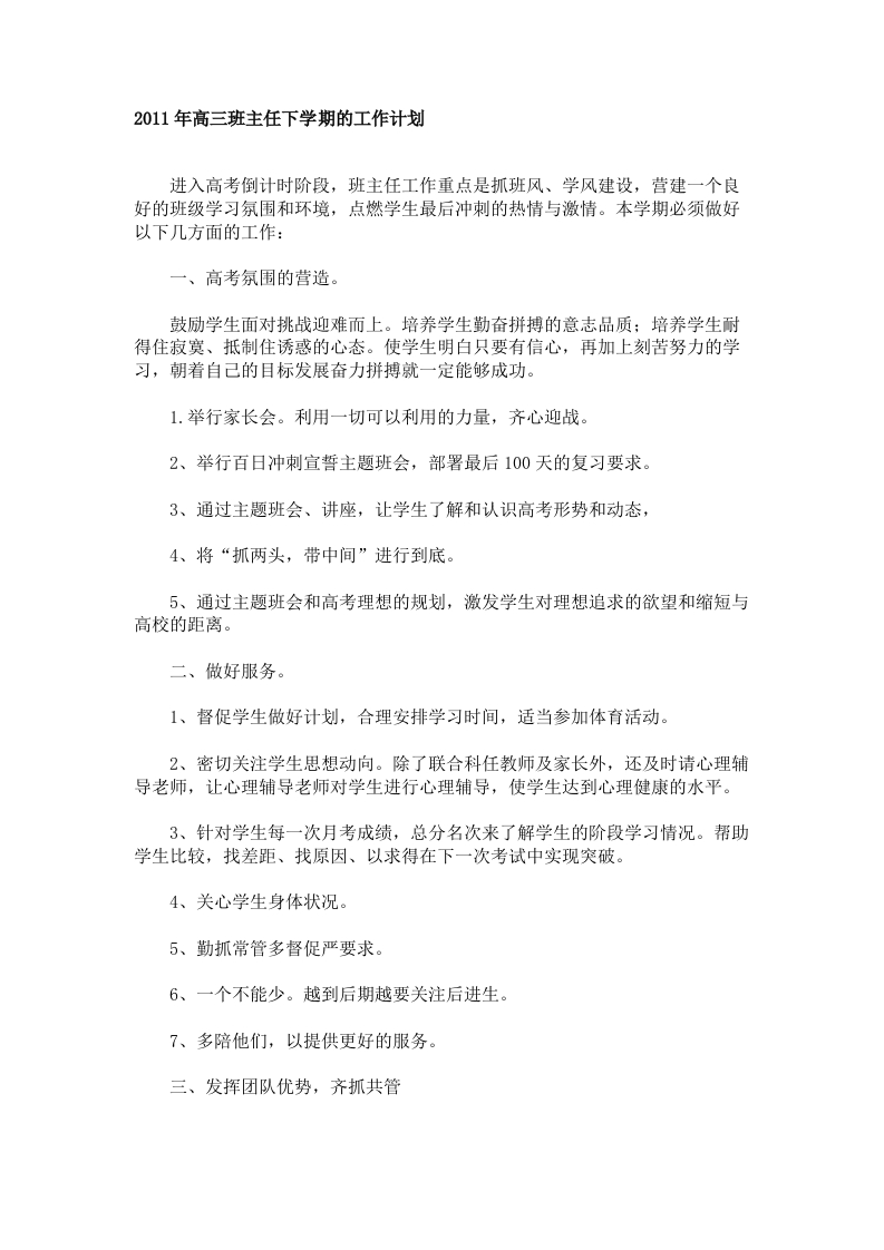 2011年高三班主任下学期的工作计划进入高考倒计时阶段,班主任工作重点是抓班风、学风建设,营建一个良好的班级学习氛围和环境,点燃学生最后冲刺的热情与激情。本学期必须做好以下几方面的工作:一、高考氛围的营造。鼓励学生面对挑战迎难而上。培养学生勤奋拼搏的意志品质:培养学生耐得住寂寞、抵制住诱惑的心态。使学生明白只要有信心,再加上刻苦努力的学习,朝着自己的目标发展奋力拼搏就一定能够成功。1.举行家长会。利用一切可以利用的力量,齐心迎战。2、举行百日冲刺宣誓主题班会,部署最后100天的复习要求。3、通过主题班会、讲座,让学生了解和认识高考形势和动态,4、将“抓两头,带中间”进行到底5、通过主题班会和高考理想的规划,激发学生对理想追求的欲望和缩短与高校的距离。二、做好服务。1、督促学生做好计划,合理安排学习时间,适当参加体育活动。2、密切关注学生思想动向。除了联合科任教师及家长外,还及时请心理辅导老师,让心理辅导老师对学生进行心理辅导,使学生达到心理健康的水平。3、针对学生每一次月考成绩,总分名次来了解学生的阶段学习情况。帮助学生比较,找差距、找原因、以求得在下一次考试中实现突破。4、关心学生身体状况。5、勤抓常管多督促严要求。6、一个不能少。越到后期越要关注后进生。7、多陪他们,以提供更好的服务。三、发挥团队优势,齐抓共管
