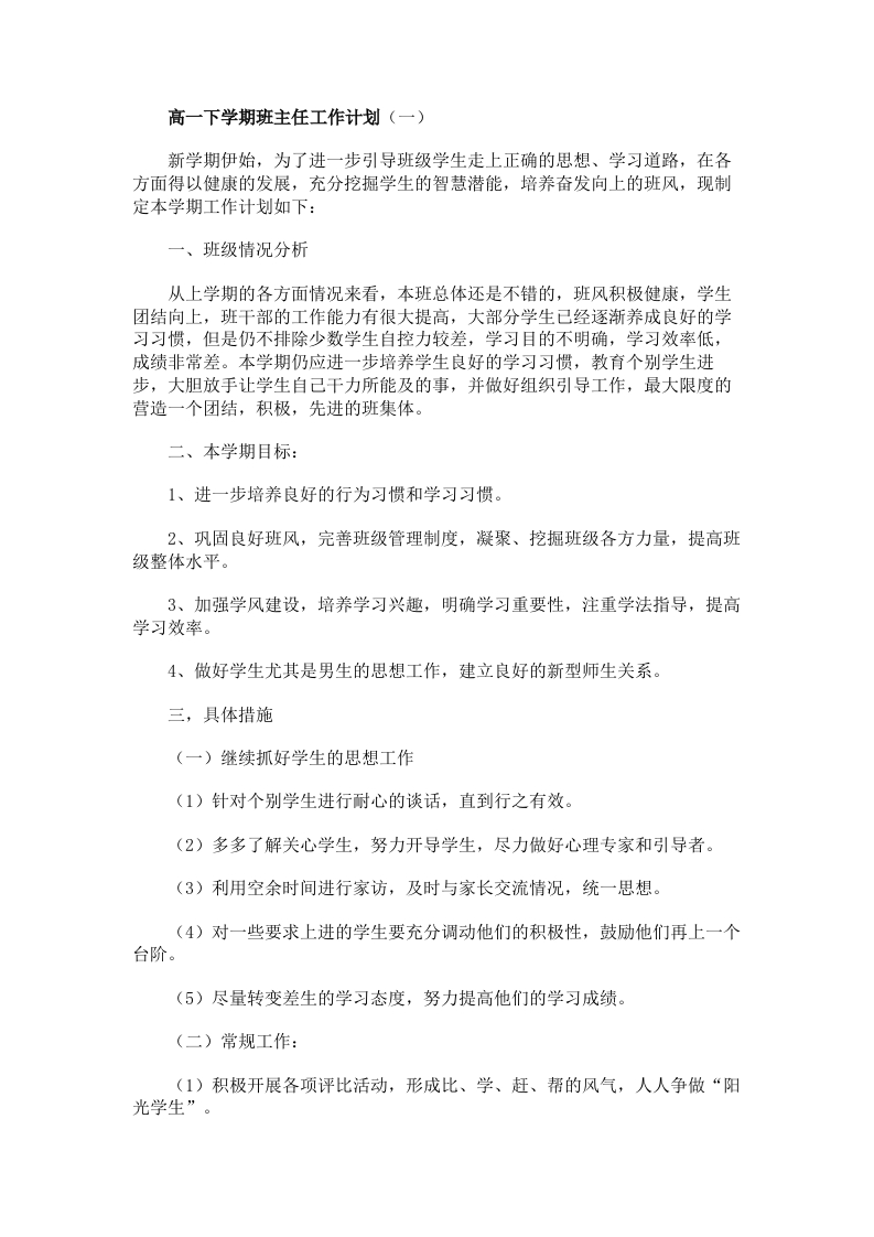 高一下学期班主任工作计划(一)新学期伊始,为了进一步引导班级学生走上正确的思想、学习道路,在各方面得以健康的发展,充分挖掘学生的智慧潜能,培养奋发向上的班风,现制定本学期工作计划如下:一、班级情况分析从上学期的各方面情况来看,本班总体还是不错的,班风积极健康,学生团结向上,班干部的工作能力有很大提高,大部分学生已经逐渐养成良好的学习习惯,但是仍不排除少数学生自控力较差,学习目的不明确,学习效率低,成绩非常差。本学期仍应进一步培养学生良好的学习习惯,教育个别学生进步,大胆放手让学生自己干力所能及的事,并做好组织引导工作,最大限度的营造一个团结,积极,先进的班集体。二、本学期目标:1、进一步培养良好的行为习惯和学习习惯。2、巩固良好班风,完善班级管理制度,凝聚、挖掘班级各方力量,提高班级整体水平。3、加强学风建设,培养学习兴趣,明确学习重要性,注重学法指导,提高学习效率。4、做好学生尤其是男生的思想工作,建立良好的新型师生关系。三,具体措施(一)继续抓好学生的思想工作(1)针对个别学生进行耐心的谈话,直到行之有效。(2)多多了解关心学生,努力开导学生,尽力做好心理专家和引导者。(3)利用空余时间进行家访,及时与家长交流情况,统一思想。(4)对一些要求上进的学生要充分调动他们的积极性,鼓励他们再上一个台阶。(5)尽量转变差生的学习态度,努力提高他们的学习成绩。(二)常规工作:(1)积极开展各项评比活动,形成比、学、赶、帮的风气,人人争做“阳光学生”。
