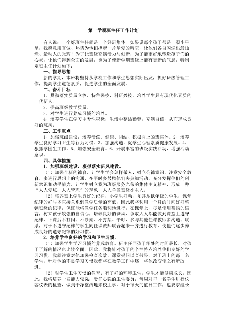 第一学期班主任工作计划有人说:一个好班主任就是一个好班集体。如果说每个孩子都是一颗小星星,我愿意用真诚、热情为他们撑起一片挚爱的晴空,让他们各自闪烁出最灿烂、最动人的光辉!为了让班级充满活力与创新,为了能更好地塑造孩子们的心灵,让他们得到全面的发展,也为了使新学期班级上能有更新的气息,特制定班主任计划如下:一、指导思想新的学期,本班将坚持从学校工作和学生思想实际出发,抓好班级管理工作,提高学生道德素质,促进学生的全面发展。二、奋斗目标1、贯彻落实质量立校,特色强校,科研兴校,培养学生具有现代化素质的一代新人。2、提高班级教学质量。3、对学生进行养成习惯的培养。4、培养学生在学习中专注积极,生活中整洁勤劳,充满自信,从而形成良好的班风。三、工作重点1、加强班级建设,培养活泼、健康、团结、积极向上的班集体。2、培养学生良好学习卫生等行为习惯。3、加强沟通,促学生心理素质健康发展。4、狠抓学困生工作。5、加强安全教育。6、开展丰富的班级实践活动,增强活动意识。四、具体措施1、加强班级建设,狠抓落实班风建设。(1)加强全班的德育,让学生学会怎样做人、树立公德意识,注意安全教育,多进行思想上的沟通,在平时多鼓励他们去参加活动,充分发挥他们的创新意识和动手能力,让学生树立我为班级服务光荣的集体主义精神,形成一种“人人爱班,人人管理”的现象,人人争做班级小主人。(2)培养班上学生良好的纪律,小学生好动,尤其是低年级的学生,课堂纪律的好与坏直接关系到教学质量的高低,因此我将利用一个月的时间好好整顿班级的纪律,保证能将教学任务顺利地进行,在课堂上,尽是使用赞扬的语言,树立孩子较强的自信心,培养良好的班风,争取人人都能做到课堂上遵守纪律,下课后不打闹、不吵架、不打架。平时,多与其他任课教师多沟通、联系,对于不遵守纪律的学生同任课教师联合起来一齐进行教育,使他们逐步养成良好的遵守纪律的好习惯。2、培养学生良好的学习和卫生习惯。(1)加强学生学习习惯的养成教育。班主任同孩子相处的时间最长,对孩子了解的情况也比较全面。因此,我将针对孩子的个性特点培养他们良好的学习习惯,我就注意对他加强检查次数,课堂提问以查效果。对于班上的每一名学生,针对他的不良学习习惯我都将在教学工作中逐一将他改变使之有所改进。(2)对学生卫生习惯的教育。有了好的环境卫生,学生才能健康成长,因此,我将培养一名能力较强,责任心强的卫生委员,每周对每一名学生进行仪容仪表的检查,做到干净整洁地来校上学,对于每天的值日工作,也要求组长