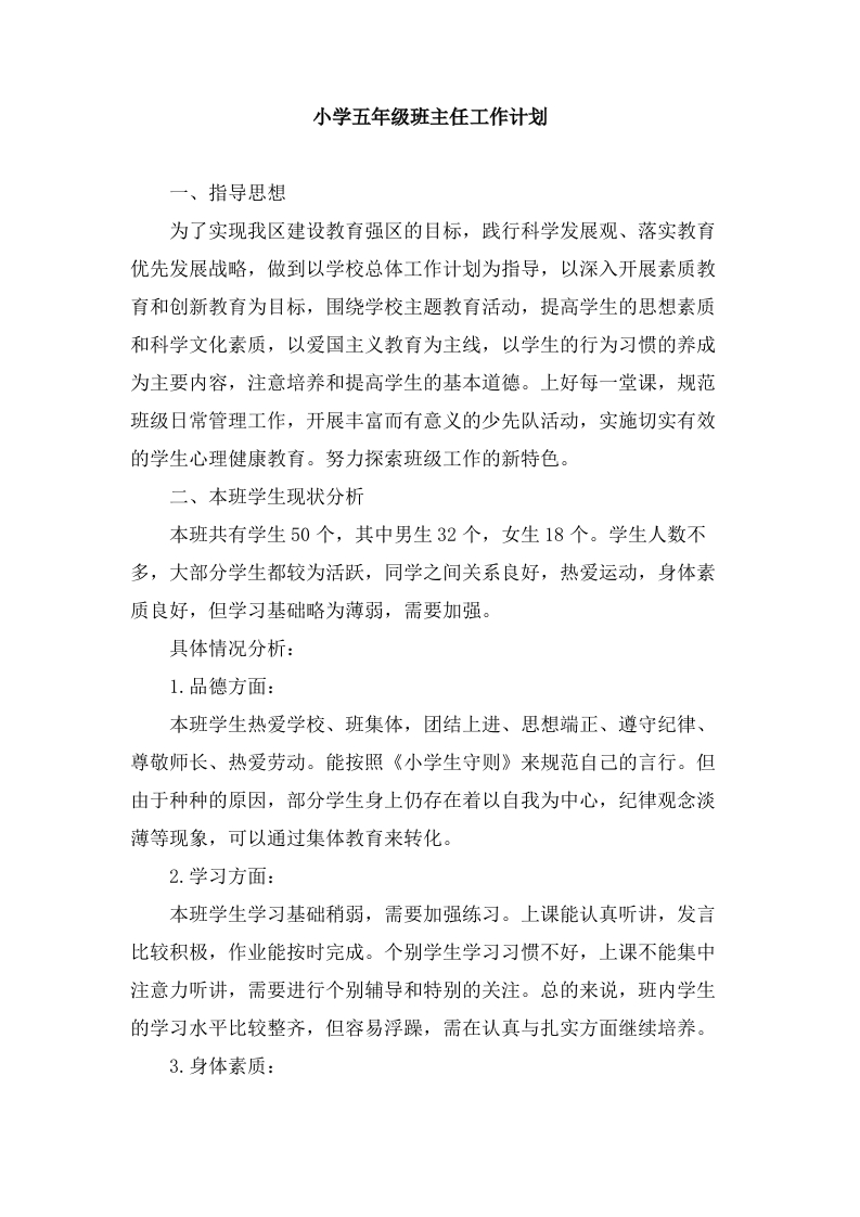 小学五年级班主任工作计划一、指导思想为了实现我区建设教育强区的目标,践行科学发展观、落实教育优先发展战略,做到以学校总体工作计划为指导,以深入开展素质教育和创新教育为目标,围绕学校主题教育活动,提高学生的思想素质和科学文化素质,以爱国主义教育为主线,以学生的行为习惯的养成为主要内容,注意培养和提高学生的基本道德。上好每一堂课,规范班级日常管理工作,开展丰富而有意义的少先队活动,实施切实有效的学生心理健康教育。努力探索班级工作的新特色。二、本班学生现状分析本班共有学生50个,其中男生32个,女生18个。学生人数不多,大部分学生都较为活跃,同学之间关系良好,热爱运动,身体素质良好,但学习基础略为薄弱,需要加强。具体情况分析:1.品德方面:本班学生热爱学校、班集体,团结上进、思想端正、遵守纪律、尊敬师长、热爱劳动。能按照《小学生守则》来规范自己的言行。但由于种种的原因,部分学生身上仍存在着以自我为中心,纪律观念淡薄等现象,可以通过集体教育来转化。2.学习方面:本班学生学习基础稍弱,需要加强练习。上课能认真听讲,发言比较积极,作业能按时完成。个别学生学习习惯不好,上课不能集中注意力听讲,需要进行个别辅导和特别的关注。总的来说,班内学生的学习水平比较整齐,但容易浮躁,需在认真与扎实方面继续培养。3.身体素质: