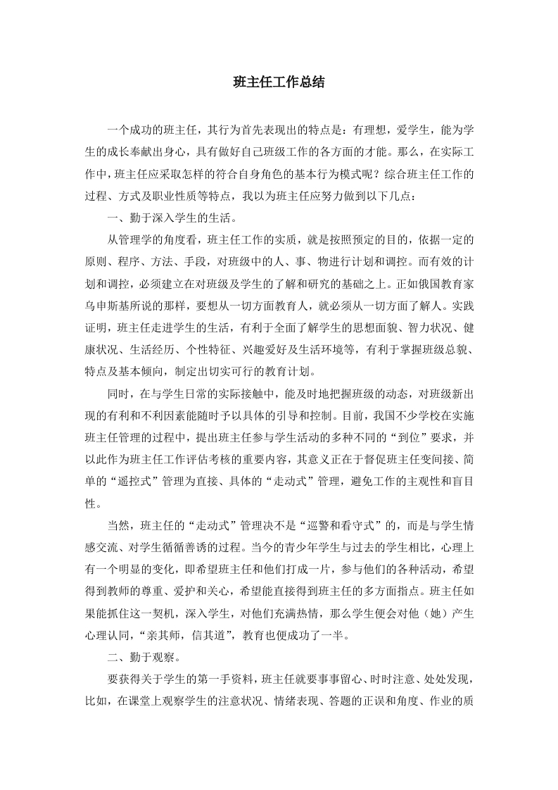 班主任工作总结一个成功的班主任,其行为首先表现出的特点是:有理想,爱学生,能为学生的成长奉献出身心,具有做好自己班级工作的各方面的才能。那么,在实际工作中,班主任应采取怎样的符合自身角色的基本行为模式呢?综合班主任工作的过程、方式及职业性质等特点,我以为班主任应努力做到以下几点:一、勤于深入学生的生活。从管理学的角度看,班主任工作的实质,就是按照预定的目的,依据一定的原则、程序、方法、手段,对班级中的人、事、物进行计划和调控。而有效的计划和调控,必须建立在对班级及学生的了解和研究的基础之上。正如俄国教育家乌申斯基所说的那样,要想从一切方面教育人,就必须从一切方面了解人。实践证明,班主任走进学生的生活,有利于全面了解学生的思想面貌、智力状况、健康状况、生活经历、个性特征、兴趣爱好及生活环境等,有利于掌握班级总貌、特点及基本倾向,制定出切实可行的教育计划。同时,在与学生日常的实际接触中,能及时地把握班级的动态,对班级新出现的有利和不利因素能随时予以具体的引导和控制。目前,我国不少学校在实施班主任管理的过程中,提出班主任参与学生活动的多种不同的“到位”要求,并以此作为班主任工作评估考核的重要内容,其意义正在于督促班主任变间接、简单的“遥控式”管理为直接、具体的“走动式”管理,避免工作的主观性和盲目性。当然,班主任的“走动式”管理决不是“巡警和看守式”的,而是与学生情感交流、对学生循循善诱的过程。当今的青少年学生与过去的学生相比,心理上有一个明显的变化,即希望班主任和他们打成一片,参与他们的各种活动,希望得到教师的尊重、爱护和关心,希望能直接得到班主任的多方面指点。班主任如果能抓住这一契机,深入学生,对他们充满热情,那么学生便会对他(她)产生心理认同,“亲其师,信其道”,教育也便成功了一半。二、勤于观察。要获得关于学生的第一手资料,班主任就要事事留心、时时注意、处处发现,比如,在课堂上观察学生的注意状况、情绪表现、答题的正误和角度、作业的质