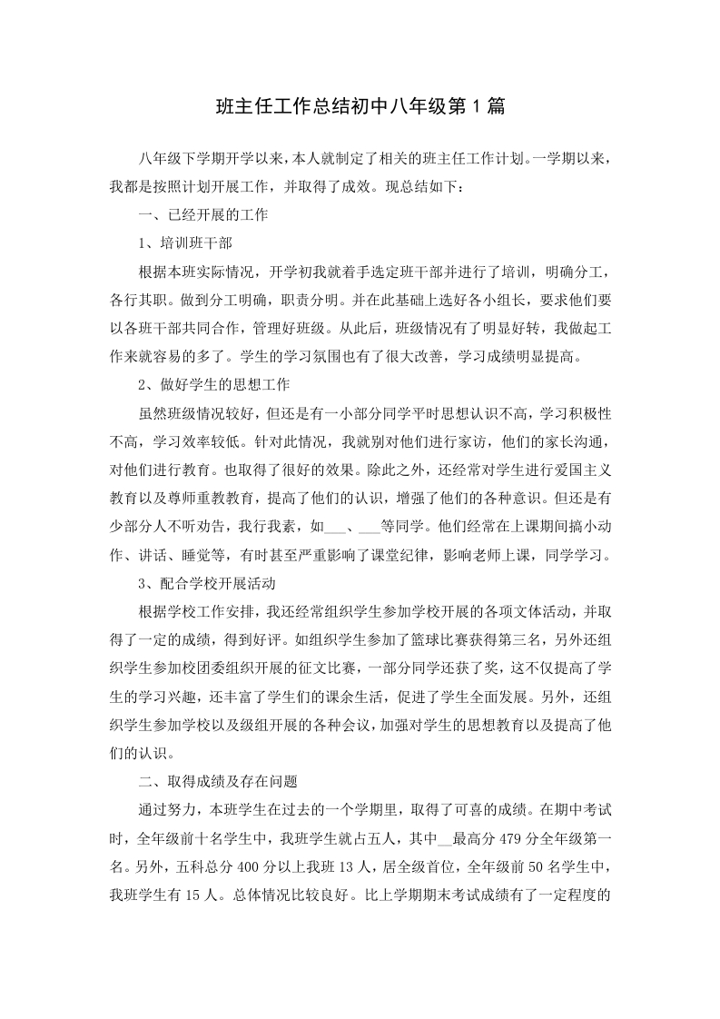班主任工作总结初中八年级第1篇八年级下学期开学以来,本人就制定了相关的班主任工作计划。一学期以来,我都是按照计划开展工作,并取得了成效。现总结如下:一、已经开展的工作1、培训班干部根据本班实际情况,开学初我就着手选定班干部并进行了培训,明确分工,各行其职。做到分工明确,职责分明。并在此基础上选好各小组长,要求他们要以各班干部共同合作,管理好班级。从此后,班级情况有了明显好转,我做起工作来就容易的多了。学生的学习氛围也有了很大改善,学习成绩明显提高。2、做好学生的思想工作虽然班级情况较好,但还是有一小部分同学平时思想认识不高,学习积极性不高,学习效率较低。针对此情况,我就别对他们进行家访,他们的家长沟通,对他们进行教育。也取得了很好的效果。除此之外,还经常对学生进行爱国主义教育以及尊师重教教育,提高了他们的认识,增强了他们的各种意识。但还是有少部分人不听劝告,我行我素,如、等同学。他们经常在上课期间搞小动作、讲话、睡觉等,有时甚至严重影响了课堂纪律,影响老师上课,同学学习。3、配合学校开展活动根据学校工作安排,我还经常组织学生参加学校开展的各项文体活动,并取得了一定的成绩,得到好评。如组织学生参加了篮球比赛获得第三名,另外还组织学生参加校团委组织开展的征文比赛,一部分同学还获了奖,这不仅提高了学生的学习兴趣,还丰富了学生们的课余生活,促进了学生全面发展。另外,还组织学生参加学校以及级组开展的各种会议,加强对学生的思想教育以及提高了他们的认识。二、取得成绩及存在问题通过努力,本班学生在过去的一个学期里,取得了可喜的成绩。在期中考试时,全年级前十名学生中,我班学生就占五人,其中最高分479分全年级第一名。另外,五科总分400分以上我班13人,居全级首位,全年级前50名学生中,我班学生有15人。总体情况比较良好。比上学期期末考试成绩有了一定程度的
