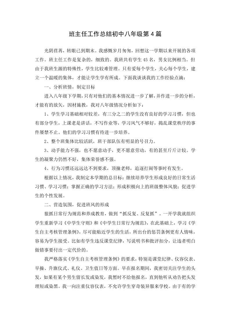 班主任工作总结初中八年级第4篇光阴荏苒,转眼已到期末。我感慨岁月匆匆,回想这一学期以来开展的各项工作。班主任工作是复杂的,细致的。我班共有学生45名,男女比例相当。但由于我班生源的特殊性,学生比较难管理。只有爱每个学生,关心每个学生,建立一个温暖的集体,才能让学生学有所成。下面我谈谈我的工作经验点滴:一、分析班情,制定目标进入八年级下学期,只有对他们的基本情况进一步了解,并作进一步的分析,才能有的放矢,因材施教,我对八年级情况分析如下:1、学生学习基础相对较差,有三分之二的学生没有良好的学习习惯,但也有部分学生,上课老是讲话,不写作业等,学习风气不够好,捣乱课堂秩序的事件屡禁不止。他们的学习习惯有待进一步培养。2、整个班集体比较活跃,班干部队伍有明显的号召力。3、动手能力不强,也不愿意动手,更不愿意劳动,有的甚至斤斤计较。学生的凝聚力仍然不好,集体荣誉感不强。4、行为习惯还远远达不到要求,顶撞老师,追逐打闹等事时有发生。根据以上情况,我制定本学期的总目标:继续培养学生形成良好的日常生活习惯、学习习惯:掌握正确的学习方法:形成积极向上的班级整体风貌:促进学生的个性发展。二、营造氛围,促进班风的形成狠抓日常行为规范和养成教育,做到“抓反复、反复抓”。一开学我就组织学生重新学习《中学生守则》和《中学生日常行为规范》,在此基础上,学习《学生自主考核管理条例》,尽可能贴近学生的生活,所出台的惩罚条例更有人情味,容易为学生接受。比如有学生违反课堂纪律,写说明书和批评扣分,让违者明白做错事要付出一定代价的。我严格落实《学生自主考核管理条例》的要求,特别是课堂纪律、仪容仪表、早操、升旗仪式、礼仪、卫生值日等方面。早在报名期间,我密切关注学生的头发,如果有某个男生留长发或染发,我暂时不给他报名,直到他听从劝告把头发理短或染黑。我一向注重仪容仪表,不允许学生穿奇装异服来学校。由于有的学