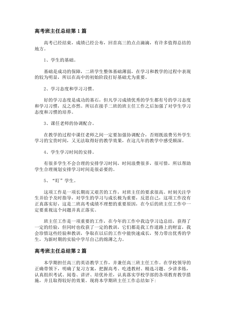 高考班主任总结第1篇高考已经结束,成绩已经公布,回首高三的点点滴滴,有许多值得总结的地方。1、学生的基础。基础是成功的保障,二班学生整体基础薄弱,在学习和教学的过程中表现的较为明显,所以在高中的初始阶段打好基础尤为重要。2、学习态度和学习习惯。好的学习态度是成功的基石,但凡学习成绩优秀的学生都有号的学习态度和学习习惯,反之亦然。所以在接手二班的班主任工作之后加强了对学生学习态度和习惯的培养。3、课任老师的协调配合。在教学的过程中课任老师之间一定要加强协调配合,否则既浪费另外学生学习的宝贵时间,又无法取得好的教学效果,在这几年的教学中感受颇深。4、学生学习时间的安排。有很多学生不会合理的安排学习时间,时间浪费很多,很可惜,所以帮助学生合理规划安排学习时间是很必要的。5、“盯”学生。这项工作是一项长期而又艰苦的工作,对班主任的要求很高。时刻关注学生并给予及时指导,对学生的学习与成长极为重要,反思自己,这项工作没有正真落实好,这是二班高考成绩不理想的重要原因,在今后的班主任工作中一定要重视这个问题并真正落实。班主任工作是一项重要的工作,在今年的工作中我边学习边总结,获得了一定的经验,但同时也收获了一定的教训,它们都是我工作道路上的财富,我会珍惜这些经验和教训,争取在以后的工作中能快速成长,努力带出优秀的学生,为新时期的实验中学尽自己的绵薄之力。高考班主任总结第2篇本学期担任高三的英语教学工作,并兼任高三班主任工作。在学校领导的正确带领下,明确了复习方案,把握高考、吃透教材、精选习题、少讲多练,认真组织考试、阅卷、讲评、培优补差,认真落实学校学部的各项教育教学措施,并且取得较好的效果。现将本学期班主任工作总结如下: