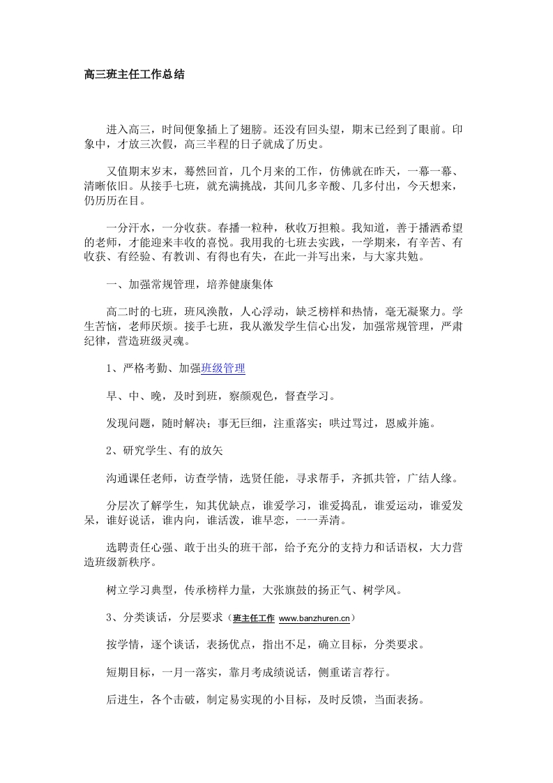 高三班主任工作总结进入高三,时间便象插上了翅膀。还没有回头望,期末已经到了眼前。印象中,才放三次假,高三半程的日子就成了历史。又值期末岁末,蓦然回首,几个月来的工作,仿佛就在昨天,一幕一幕、清晰依旧。从接手七班,就充满挑战,其间几多辛酸、几多付出,今天想来,仍历历在目。一分汗水,一分收获。春播一粒种,秋收万担粮。我知道,善于播洒希望的老师,才能迎来丰收的喜悦。我用我的七班去实践,一学期来,有辛苦、有收获、有经验、有教训、有得也有失,在此一并写出来,与大家共勉。一、加强常规管理,培养健康集体高二时的七班,班风涣散,人心浮动,缺乏榜样和热情,毫无凝聚力。学生苦恼,老师厌烦。接手七班,我从激发学生信心出发,加强常规管理,严肃纪律,营造班级灵魂。1、严格考勤、加强班级管理早、中、晚,及时到班,察颜观色,督查学习。发现问题,随时解决:事无巨细,注重落实;哄过骂过,恩威并施。2、研究学生、有的放矢沟通课任老师,访查学情,选贤任能,寻求帮手,齐抓共管,广结人缘。分层次了解学生,知其优缺点,谁爱学习,谁爱捣乱,谁爱运动,谁爱发呆,谁好说话,谁内向,谁活泼,谁早恋,一一弄清。选聘责任心强、敢于出头的班干部,给予充分的支持力和话语权,大力营造班级新秩序。树立学习典型,传承榜样力量,大张旗鼓的扬正气、树学风。3、分类谈话,分层要求(班主任工作www.banzhuren.cn)按学情,逐个谈话,表扬优点,指出不足,确立目标,分类要求。短期目标,一月一落实,靠月考成绩说话,侧重诺言荐行。后进生,各个击破,制定易实现的小目标,及时反馈,当面表扬。