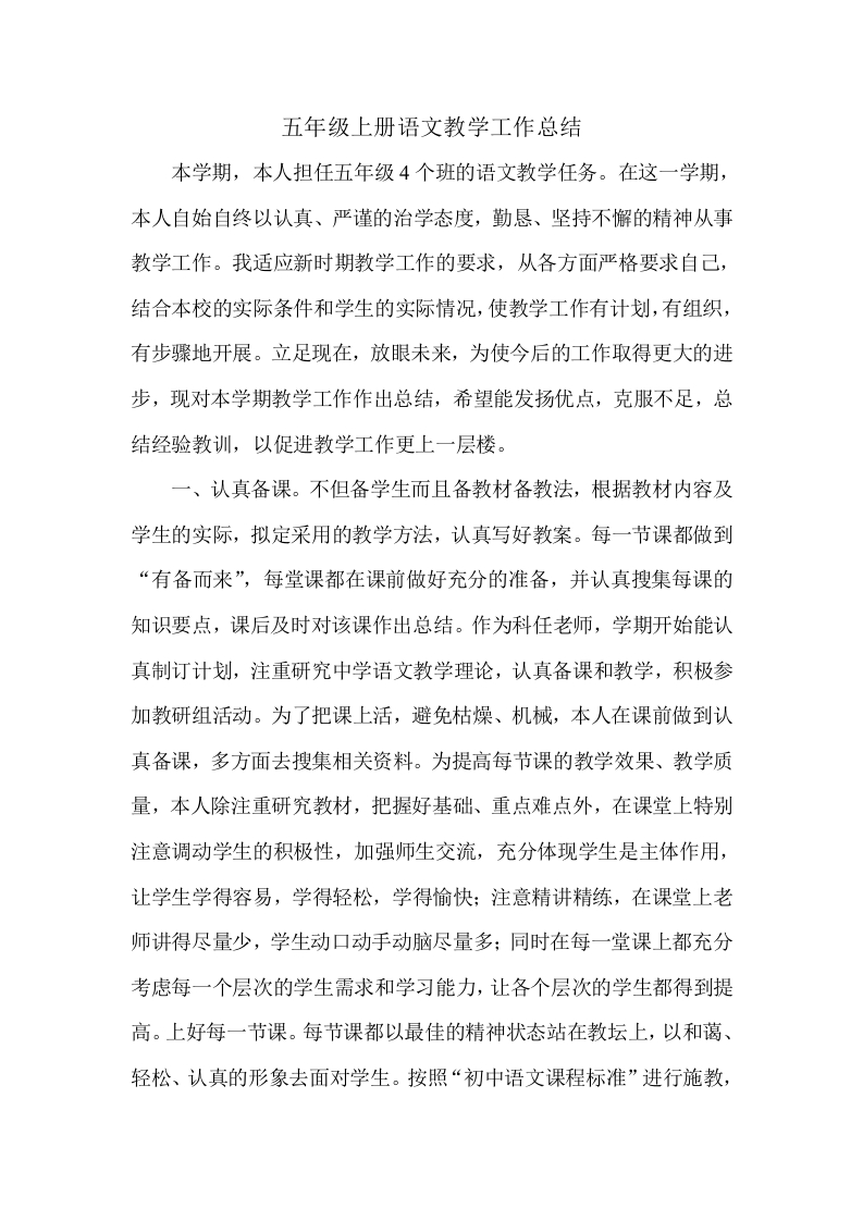 五年级上册语文教学工作总结本学期,本人担任五年级4个班的语文教学任务。在这一学期,本人自始自终以认真、严谨的治学态度,勤恳、坚持不懈的精神从事教学工作。我适应新时期教学工作的要求,从各方面严格要求自己,结合本校的实际条件和学生的实际情况,使教学工作有计划,有组织,有步骤地开展。立足现在,放眼未来,为使今后的工作取得更大的进步,现对本学期教学工作作出总结,希望能发扬优点,克服不足,总结经验教训,以促进教学工作更上一层楼。一、认真备课。不但备学生而且备教材备教法,根据教材内容及学生的实际,拟定采用的教学方法,认真写好教案。每一节课都做到“有备而来”,每堂课都在课前做好充分的准备,并认真搜集每课的知识要点,课后及时对该课作出总结。作为科任老师,学期开始能认真制订计划,注重研究中学语文教学理论,认真备课和教学,积极参加教研组活动。为了把课上活,避免枯燥、机械,本人在课前做到认真备课,多方面去搜集相关资料。为提高每节课的教学效果、教学质量,本人除注重研究教材,把握好基础、重点难点外,在课堂上特别注意调动学生的积极性,加强师生交流,充分体现学生是主体作用,让学生学得容易,学得轻松,学得愉快:注意精讲精练,在课堂上老师讲得尽量少,学生动口动手动脑尽量多:同时在每一堂课上都充分考虑每一个层次的学生需求和学习能力,让各个层次的学生都得到提高。上好每一节课。每节课都以最佳的精神状态站在教坛上,以和蔼、轻松、认真的形象去面对学生。按照“初中语文课程标准”进行施教,