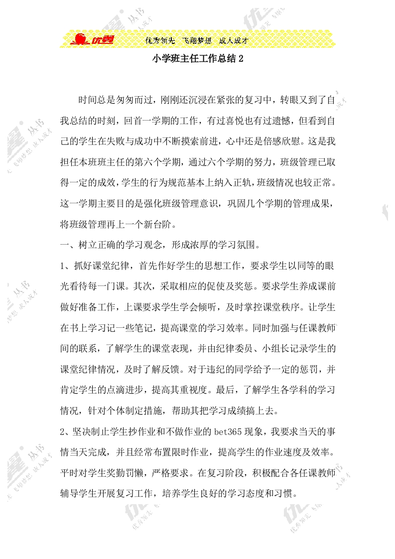 优型优秀领光飞翔梦想成人成才小学班主任工作总结2时间总是匆匆而过,刚刚还沉浸在紧张的复习中,转眼又到了自从书我总结的时刻,回首一学期的工作,有过喜悦也有过遗憾,但看到自己的学生在失败与成功中不断摸索前进,心中还是倍感欣慰。这是我担任本班班主任的第六个学期,通过六个学期的努力,班级管理已取得一定的成效,学生的行为规范基本上纳入正轨,班级情况也较正常。这一学期主要目的是强化班级管理意识,巩固几个学期的管理成果,将班级管理再上一个新台阶。一、树立正确的学习观念,形成浓厚的学习氛围。1、抓好课堂纪律,首先作好学生的思想工作,要求学生以同等的眼从书光看待每一门课。其次,采取相应的促使及奖惩。要求学生养成课前成天成做好准备工作,上课要求学生学会倾听,及时掌控课堂秩序。让学生梦在书上学习记一些笔记,提高课堂的学习效率。同时加强与任课教师间的联系,了解学生的课堂表现,并由纪律委员、小组长记录学生的课堂纪律情况,及时了解反馈。对于违纪的同学给予一定的惩罚,并肯定学生的点滴进步,提高其重视度。最后,了解学生各学科的学习情况,针对个体制定措施,帮助其把学习成绩搞上去。2、坚决制止学生抄作业和不做作业的bet365现象,我要求当天的事丛书成人液李情当天完成,并且经常布置限时作业,提高学生的作业速度及效率。飞雠沙平时对学生奖勤罚懒,严格要求。在复习阶段,积极配合各任课教师辅导学生开展复习工作,培养学生良好的学习态度和习惯。优秀演先优秀领完