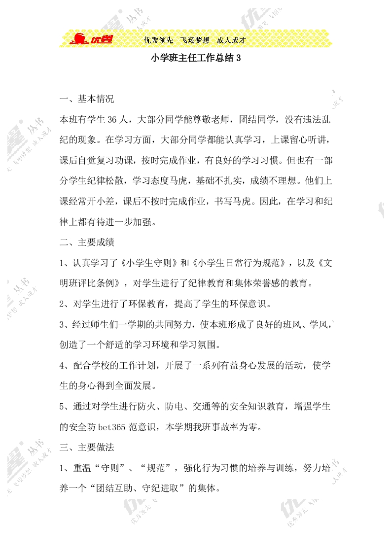 优皮优秀领光飞翔梦想成人成才小学班主任工作总结3一、基本情况从书本班有学生36人,大部分同学能尊敬老师,团结同学,没有违法乱纪的现象。在学习方面,大部分同学都能认真学习,上课留心听讲,课后自觉复习功课,按时完成作业,有良好的学习习惯。但也有一部分学生纪律松散,学习态度马虎,基础不扎实,成绩不理想。他们上课经常开小差,课后不按时完成作业,书写马虎。因此,在学习和纪律上都有待进一步加强。二、主要成绩1、认真学习了《小学生守则》和《小学生日常行为规范》,以及《文从书明班评比条例》,对学生进行了纪律教育和集体荣誉感的教育。成天成2、对学生进行了环保教育,提高了学生的环保意识。3、经过师生们一学期的共同努力,使本班形成了良好的班风、学风,创造了一个舒适的学习环境和学习氛围。4、配合学校的工作计划,开展了一系列有益身心发展的活动,使学生的身心得到全面发展。5、通过对学生进行防火、防电、交通等的安全知识教育,增强学生的安全防bet365范意识,本学期我班事故率为零。丛书三、主要做法飞绿梦成人1、重温“守则”、“规范”,强化行为习惯的培养与训练,努力培养一个“团结互助、守纪进取”的集体。优秀优秀领先