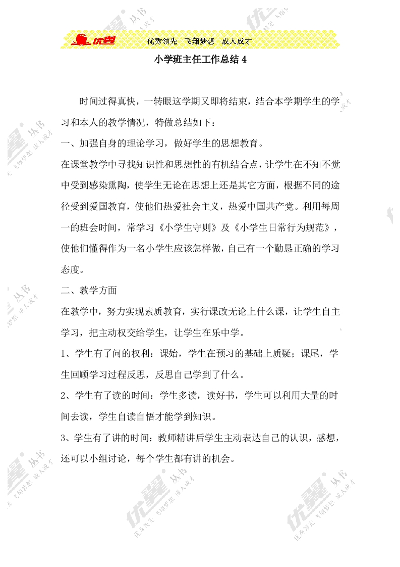 枕秀领光飞翔梦想成人成才小学班主任工作总结4时间过得真快,一转眼这学期又即将结束,结合本学期学生的学从习和本人的教学情况,特做总结如下:一、加强自身的理论学习,做好学生的思想教育。在课堂教学中寻找知识性和思想性的有机结合点,让学生在不知不觉中受到感染熏陶,使学生无论在思想上还是其它方面,根据不同的途径受到爱国教育,使他们热爱社会主义,热爱中国共产党。利用每周一的班会时间,常学习《小学生守则》及《小学生日常行为规范》,使他们懂得作为一名小学生应该怎样做,自己有一个勤恳正确的学习态度。从书二、教学方面天成方在教学中,努力实现素质教育,实行课改无论上什么课,让学生自主梦想学习,把主动权交给学生,让学生在乐中学。1、学生有了问的权利:课始,学生在预习的基础上质疑;课尾,学生回顾学习过程反思,反思自己学到了什么。2、学生有了读的时间:学生多读,读好书,学生可以利用大量的时间去读,学生自读自悟才能学到知识。3、学生有了讲的时间:教师精讲后学生主动表达自己的认识,感想,丛书还可以小组讨论,每个学生都有讲的机会。飞梦人从书优秀洪是:飞湖梦知成入成从书院秀领完飞湖梦德论入战香之