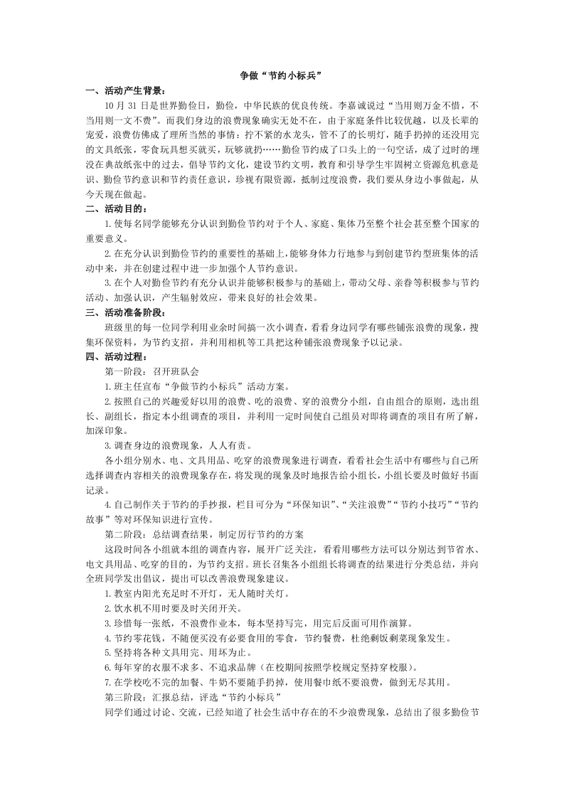 争做“节约小标兵”一、活动产生背景:10月31日是世界勤俭日,勤俭,中华民族的优良传统。李嘉诚说过“当用则万金不惜,不当用则一文不费”。而我们身边的浪费现象确实无处不在,由于家庭条件比较优越,以及长辈的宠爱,浪费仿佛成了理所当然的事情:拧不紧的水龙头,管不了的长明灯,随手扔掉的还没用完的文具纸张,琴食玩具想买就买,玩够就扔…勤俭节约成了口头上的一句空话,成了过时的埋没在典故纸张中的过去,倡导节约文化,建设节约文明,教育和引导学生牢固树立资源危机意是识、勤俭节约意识和节约责任意识,珍视有限资源,抵制过度浪费,我们要从身边小事做起,从今天现在做起。二、活动目的:1.使每名同学能够充分认识到勤俭节约对于个人、家庭、集体乃至整个社会甚至整个国家的重要意义。2.在充分认识到勤俭节约的重要性的基础上,能够身体力行地参与到创建节约型班集体的活动中来,并在创建过程中进一步加强个人节约意识。3.在个人对勤俭节约有充分认识并能够积极参与的基础上,带动父母、亲眷等积极参与节约活动、加强认识,产生辐射效应,带来良好的社会效果。三、活动准备阶段:班级里的每一位同学利用业余时间搞一次小调查,看看身边同学有哪些铺张浪费的现象,搜集环保资料,为节约支招,并利用相机等工具把这种铺张浪费现象予以记录。四、活动过程:第一阶段:召开班队会1.班主任宜布“争做节约小标兵”活动方案。2.按照自己的兴趣爱好以用的浪费、吃的浪费、穿的浪费分小组,自由组合的原则,选出组长、副组长,指定本小组调查的项目,并利用一定时间使自己组员对即将调查的项目有所了解,加深印象。3.调查身边的浪费现象,人人有责。各小组分别水、电、文具用品、吃穿的浪费现象进行调查,看看社会生活中有哪些与自己所选择调查内容相关的浪费现象存在,将发现的现象及时地报告给小组长,小组长要及时做好书面记录。4.自己制作关于节约的手抄报,栏目可分为“环保知识”、“关注浪费”“节约小技巧”“节约故事”等对环保知识进行宜传。第二阶段:总结调查结果,制定厉行节约的方案这段时间各小组就本组的调查内容,展开广泛关注,看看用哪些方法可以分别达到节省水、电文具用品、吃穿的目的,为节约支招。班长召集各小组组长将调查的结果进行分类总结,并向全班同学发出倡议,提出可以改善浪费现象建议。1.教室内阳光充足时不开灯,无人随时关灯。2.饮水机不用时要及时关闭开关。3.珍惜每一张纸,不浪费作业本,每本坚持写完,用完后反面可用作演算。4.节约零花钱,不随便买没有必要食用的零食,节约餐费,杜绝剩饭剩菜现象发生。5.坚持将各种文具用完、用坏为止。6.每年穿的衣服不求多、不追求品牌(在校期间按照学校规定坚持穿校服)。7.在学校吃不完的加餐、牛奶不要随手扔掉,使用餐巾纸不要浪费,做到无尽其用。第三阶段:汇报总结,评选“节约小标兵”同学们通过讨论、交流,已经知道了社会生活中存在的不少浪费现象,总结出了很多勤俭节