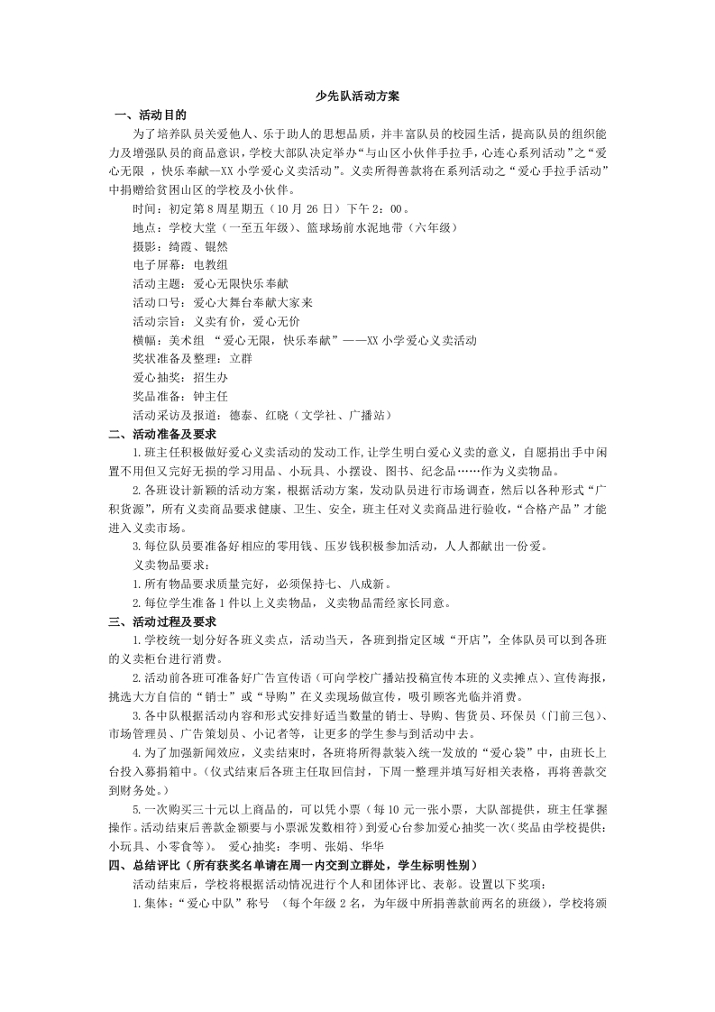 少先队活动方案一、活动目的为了培养队员关爱他人、乐于助人的思想品质,并丰富队员的校园生活,提高队员的组织能力及增强队员的商品意识,学校大部队决定举办“与山区小伙伴手拉手,心连心系列活动”之“爱心无限,快乐奉献一XX小学爱心义卖活动”。义卖所得善款将在系列活动之“爱心手拉手活动”中捐赠给贫困山区的学校及小伙伴。时间:初定第8周星期五(10月26日)下午2:00。地点:学校大堂(一至五年级)、篮球场前水泥地带(六年级)摄影:绮霞、银然电子屏幕:电教组活动主题:爱心无限快乐奉献活动口号:爱心大舞台奉献大家来活动宗旨:义卖有价,爱心无价横幅:美术组“爱心无限,快乐奉献”一一小学爱心义卖活动奖状准备及整理:立群爱心抽奖:招生办奖品准备:钟主任活动采访及报道:德泰、红晓(文学社、广播站)二、活动准备及要求1.班主任积极做好爱心义卖活动的发动工作,让学生明白爱心义卖的意义,自愿捐出手中闲置不用但又完好无损的学习用品、小玩具、小摆设、图书、纪念品…作为义卖物品。2.各班设计新颖的活动方案,根据活动方案,发动队员进行市场调查,然后以各种形式“广积货源”,所有义卖商品要求健康、卫生、安全,班主任对义卖商品进行验收,“合格产品”才能进入义卖市场。3.每位队员要准备好相应的零用钱、压岁钱积极参加活动,人人都献出一份爱。义卖物品要求:1.所有物品要求质量完好,必须保持七、八成新2.每位学生准备1件以上义卖物品,义卖物品需经家长同意三、活动过程及要求1.学校统一划分好各班义卖点,活动当天,各班到指定区域“开店”,全体队员可以到各班的义卖柜台进行消费。2.活动前各班可准备好广告宜传语(可向学校广播站投稿宜传本班的义卖摊点)、宜传海报,挑选大方自信的“销士”或“导购”在义卖现场做宜传,吸引顾客光临并消费。3.各中队根据活动内容和形式安排好适当数量的销士、导购、售货员、环保员(门前三包)市场管理员、广告策划员、小记者等,让更多的学生参与到活动中去。4.为了加强新闻效应,义卖结束时,各班将所得款装入统一发放的“爱心袋”中,由班长上台投入募捐箱中。(仪式结束后各班主任取回信封,下周一整理并填写好相关表格,再将善款交到财务处。)5.一次购买三十元以上商品的,可以凭小票(每10元一张小票,大队部提供,班主任学握操作。活动结束后善款金额要与小票派发数相符)到爱心台参加爱心抽奖一次(奖品由学校提供:小玩具、小零食等)。爱心抽奖:李明、张娟、华华四、总结评比(所有获奖名单请在周一内交到立群处,学生标明性别)活动结束后,学校将根据活动情况进行个人和团体评比、表彰。设置以下奖项:1.集体:“爱心中队”称号(每个年级2名,为年级中所捐善款前两名的班级),学校将贾