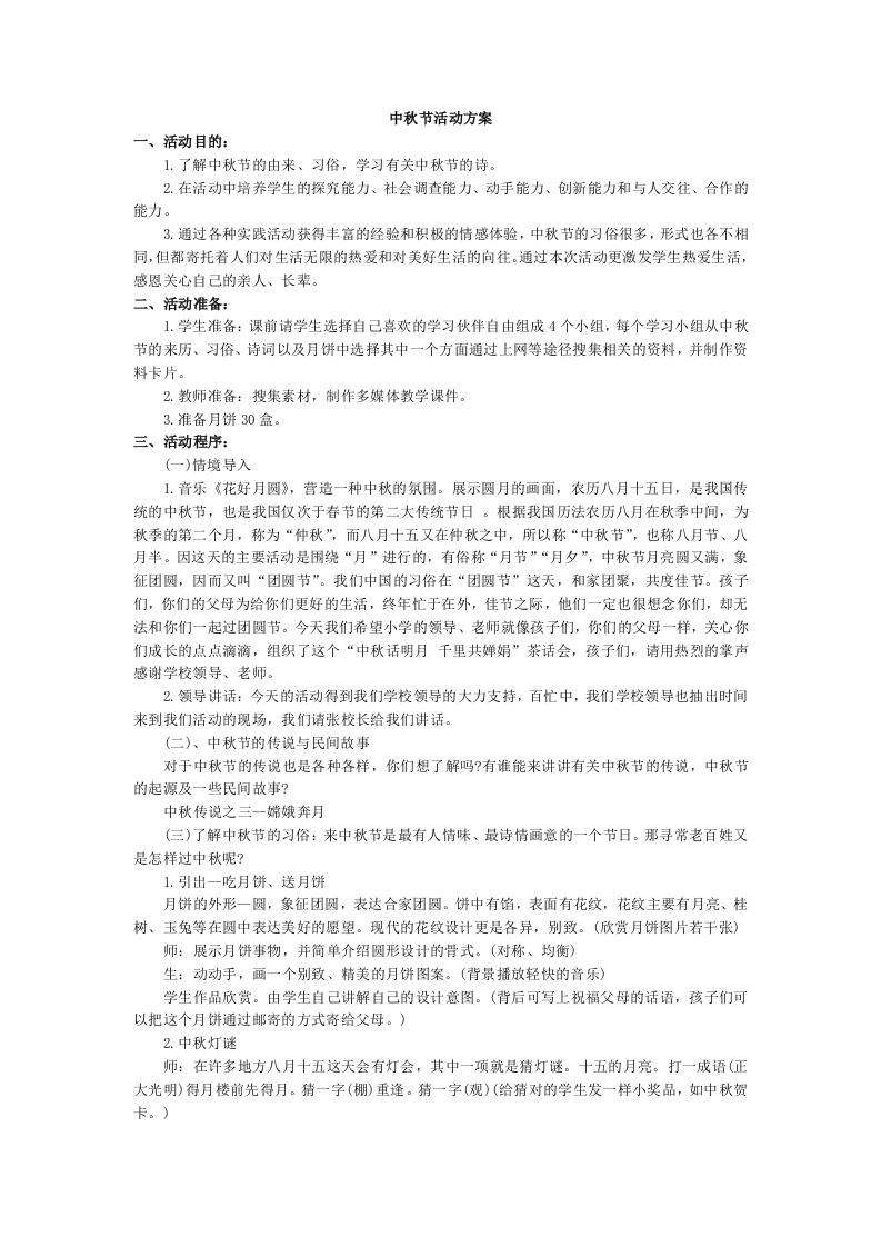 中秋节活动方案一、活动目的:1.了解中秋节的由来、习俗,学习有关中秋节的诗。2.在活动中培养学生的探究能力、社会调查能力、动手能力、创新能力和与人交往、合作的能力。3.通过各种实践活动获得丰富的经验和积极的情感体验,中秋节的习俗很多,形式也各不相同,但都寄托着人们对生活无限的热爱和对美好生活的向往。通过本次活动更激发学生热爱生活,感恩关心自己的亲人、长辈。二、活动准备:1.学生准备:课前请学生选择自己喜欢的学习伙伴自由组成4个小组,每个学习小组从中秋节的来历、习俗、诗词以及月饼中选择其中一个方面通过上网等途径搜集相关的资料,并制作资料卡片。2.教师准备:搜集素材,制作多媒体教学课件。3.准备月饼30盒。三、活动程序:(一)情境导入1.音乐《花好月圆》,营造一种中秋的氛围。展示圆月的画面,农历八月十五日,是我因传统的中秋节,也是我国仅次于春节的第二大传统节日。根据我国历法农历八月在秋季中间,为秋季的第二个月,称为“仲秋”,而八月十五又在仲秋之中,所以称“中秋节”,也称八月节、八月半。因这天的主要活动是围绕“月”进行的,有俗称“月节”“月夕”,中秋节月亮圆又满,象征团圆,因而又叫“团圆节”。我们中国的习俗在“团圆节”这天,和家团聚,共度佳节。孩子们,你们的父母为给你们更好的生活,终年忙于在外,佳节之际,他们一定也很想念你们,却无法和你们一起过团圆节。今天我们希望小学的领导、老师就像孩子们,你们的父母一样,关心你们成长的点点滴滴,组织了这个“中秋话明月千里共婵娟”茶话会,孩子们,请用热烈的掌声感谢学校领导、老师。2.领导讲话:今天的活动得到我们学校领导的大力支持,百忙中,我们学校领导也抽出时间来到我们活动的现场,我们请张校长给我们讲话。(二)、中秋节的传说与民间故事对于中秋节的传说也是各种各样,你们想了解吗?有谁能来讲讲有关中秋节的传说,中秋节的起源及一些民间故事?中秋传说之三一嫦娥奔月(三)了解中秋节的习俗:来中秋节是最有人情味、最诗情画意的一个节日。那寻常老百姓又是怎样过中秋呢?1.引出一吃月饼、送月饼月饼的外形一圆,象征团圆,表达合家团圆。饼中有馅,表面有花纹,花纹主要有月亮、桂树、玉兔等在圆中表达美好的愿望。现代的花纹设计更是各异,别致。(欣赏月饼图片若干张)师:展示月饼事物,并简单介绍圆形设计的骨式。(对称、均衡)生:动动手,画一个别致、精美的月饼图案。(背景播放轻快的音乐)学生作品欣赏。由学生自己讲解自己的设计意图。(背后可写上祝福父母的话语,孩子们可以把这个月饼通过邮寄的方式寄给父母。)2.中秋灯送师:在许多地方八月十五这天会有灯会,其中一项就是猜灯谜。十五的月亮。打一成语(正大光明)得月楼前先得月。猜一字(棚)重逢。猜一字(观)(给猜对的学生发一样小奖品,如中秋贺卡。)
