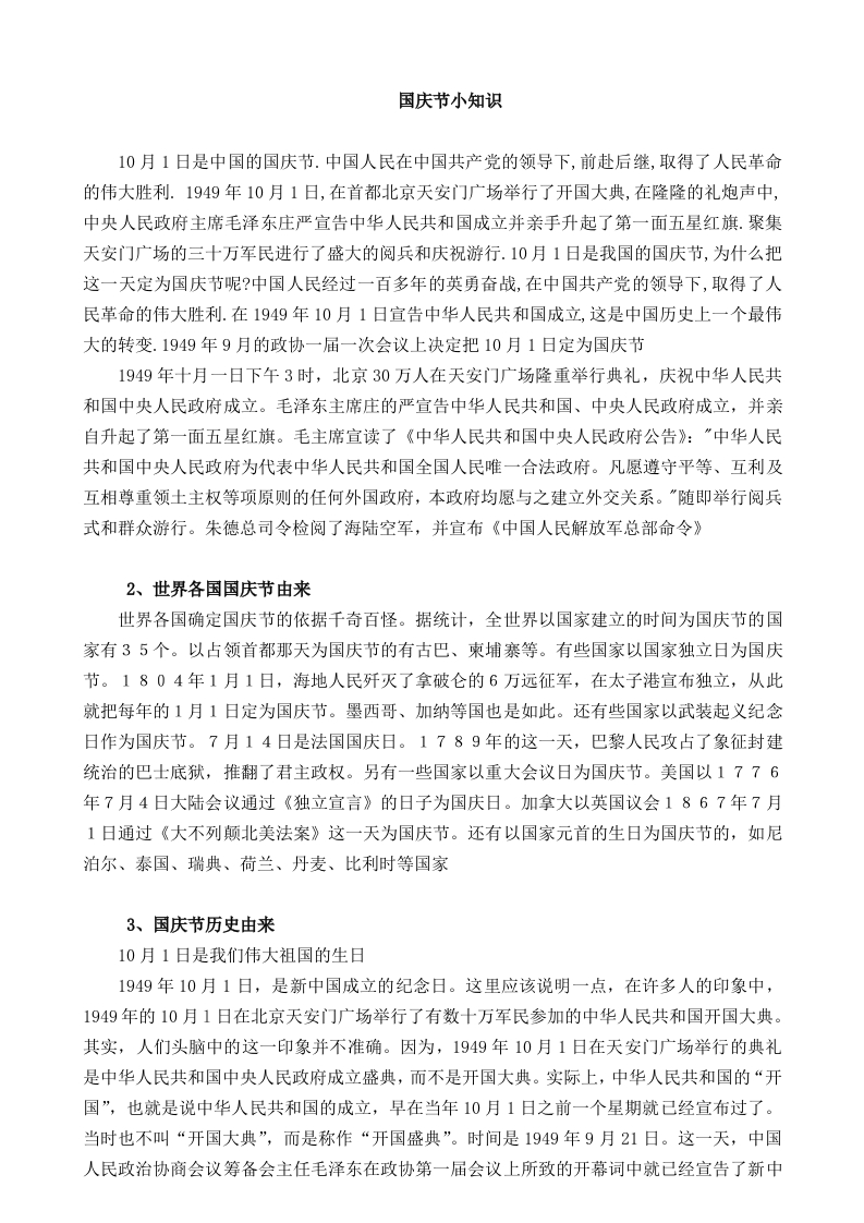 国庆节小知识10月1日是中国的国庆节.中国人民在中国共产党的领导下,前赴后继,取得了人民革命的伟大胜利.1949年10月1日,在首都北京天安门广场举行了开国大典,在隆隆的礼炮声中,中央人民政府主席毛泽东庄严宣告中华人民共和国成立并亲手升起了第一面五星红旗.聚集天安门广场的三十万军民进行了盛大的阅兵和庆祝游行.10月1日是我国的国庆节,为什么把这一天定为国庆节呢?中国人民经过一百多年的英勇奋战,在中国共产党的领导下,取得了人民革命的伟大胜利.在1949年10月1日宣告中华人民共和国成立,这是中国历史上一个最伟大的转变.1949年9月的政协一届一次会议上决定把10月1日定为国庆节1949年十月一日下午3时,北京30万人在天安门广场隆重举行典礼,庆祝中华人民共和国中央人民政府成立。毛泽东主席庄的严宣告中华人民共和国、中央人民政府成立,并亲自升起了第一面五星红旗。毛主席宣读了《中华人民共和国中央人民政府公告》:“中华人民共和国中央人民政府为代表中华人民共和国全国人民唯一合法政府。凡愿遵守平等、互利及互相尊重领土主权等项原则的任何外国政府,本政府均愿与之建立外交关系。“随即举行阅兵式和群众游行。朱德总司令检阅了海陆空军,并宣布《中国人民解放军总部命令》2、世界各国国庆节由来世界各国确定国庆节的依据千奇百怪。据统计,全世界以国家建立的时间为国庆节的国家有35个。以占领首都那天为国庆节的有古巴、柬埔寨等。有些国家以国家独立日为国庆节。1804年1月1日,海地人民歼灭了拿破仑的6万远征军,在太子港宣布独立,从此就把每年的1月1日定为国庆节。墨西哥、加纳等国也是如此。还有些国家以武装起义纪念日作为国庆节。7月14日是法国国庆日。1789年的这一天,巴黎人民攻占了象征封建统治的巴士底狱,推翻了君主政权。另有一些国家以重大会议日为国庆节。美国以1776年7月4日大陆会议通过《独立宣言》的日子为国庆日。加拿大以英国议会1867年7月1日通过《大不列颠北美法案》这一天为国庆节。还有以国家元首的生日为国庆节的,如尼泊尔、泰国、瑞典、荷兰、丹麦、比利时等国家3、国庆节历史由来10月1日是我们伟大祖国的生日1949年10月1日,是新中国成立的纪念日。这里应该说明一点,在许多人的印象中,1949年的10月1日在北京天安门广场举行了有数十万军民参加的中华人民共和国开国大典其实,人们头脑中的这一印象并不准确。因为,1949年10月1日在天安门广场举行的典礼是中华人民共和国中央人民政府成立盛典,而不是开国大典。实际上,中华人民共和国的“开国”,也就是说中华人民共和国的成立,早在当年10月1日之前一个星期就已经宣布过了。当时也不叫“开国大典”,而是称作“开国盛典”。时间是1949年9月21日。这一天,中国人民政治协商会议筹备会主任毛泽东在政协第一届会议上所致的开幕词中就已经宣告了新中