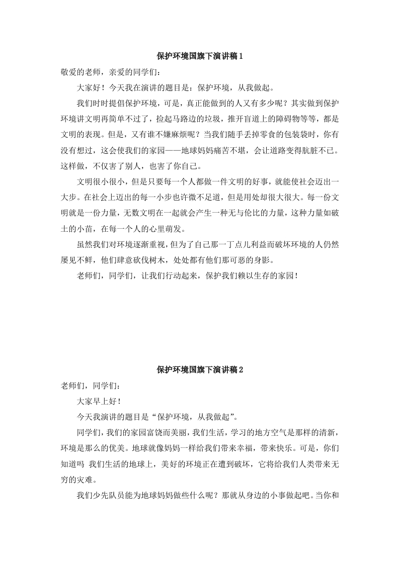 保护环境国旗下演讲稿1敬爱的老师,亲爱的同学们:大家好!今天我在演讲的题目是:保护环境,从我做起。我们时时提倡保护环境,可是,真正能做到的人又有多少呢?其实做到保护环境讲文明再简单不过了,捡起马路边的垃圾,推开盲道上的障碍物等等,都是文明的表现。但是,又有谁不嫌麻烦呢?当我们随手丢掉零食的包装袋时,你有没有想过,这会使我们的家园一一地球妈妈痛苦不堪,会让道路变得肮脏不已。这样做,不仅害了别人,也害了你自己。文明很小很小,但是只要每一个人都做一件文明的好事,就能使社会迈出一大步。在社会上迈出的每一小步也许微不足道,但是用处却很大很大。每一份文明就是一份力量,无数文明在一起就会产生一种无与伦比的力量,这种力量如破土的小苗,在每一个人的心里萌发虽然我们对环境逐渐重视,但为了自己那一丁点儿利益而破坏环境的人仍然屡见不鲜,他们肆意砍伐树木,处处都有他们那可恶的身影。老师们,同学们,让我们行动起来,保护我们赖以生存的家园!保护环境国旗下演讲稿2老师们,同学们:大家早上好!今天我演讲的题目是“保护环境,从我做起”。同学们,我们的家园富饶而美丽,我们生活,学习的地方空气是那样的清新,环境是那么的优美。地球就像妈妈一样给我们带来幸福,带来快乐。可是,你们知道吗我们生活的地球上,美好的环境正在遭到破坏,它将给我们人类带来无穷的灾难。我们少先队员能为地球妈妈做些什么呢?那就从身边的小事做起吧。当你和