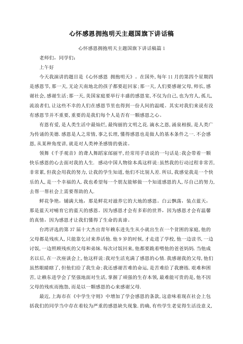心怀感恩拥抱明天主题国旗下讲话稿心怀感恩拥抱明天主题国旗下讲话稿篇1老师们,同学们:上午好今天我演讲的题目是《心怀感恩拥抱明天》。在国外,每年11月的第四个星期四是感恩节,那一天,无论天南地北的孩子都要赶回家:那一天,人们要感谢父母,师长,感谢社会,感谢生活:那一天,美国家庭要举行丰盛的感恩宴,不仅为自己,也为穷人,孤儿,流浪者们,让这些不幸的人们在感恩节里也得到一份人间的温暖。其实对我们来说有没有感恩节并不重要,重要的是我们每个人是否有一颗感恩之心。有恩有爱,是人类生活中最灿烂,最绚丽的文明之花.滴水之恩,涌泉相报,是人类广为传诵的美德.感恩是人之常情,事之长理,懂得感恩也是做人的基本条件之一.不会感恩,从某种角度讲,就是对人类神圣感情的亵渎。领舞《千手观音》的聋人舞蹈家部丽平,经常用手语说的一句话是:我会带着一颗快乐感恩的心去面对我的人生.感动中国人物徐本禹这样说:虽然我的行动过程非常苦,非常累,但我会用我的努力,让我的学生知道,他们不比别人差.所以,我感觉我是一个快乐的人,是一个幸福的人.我也希望每一个朋友能够做一个知道感恩的人,尽自己的努力,去帮一帮社会上需要帮助的人,鲜花争艳,铺满大地,那是鲜花对滋养它的大地的感恩。白云飘荡,装点蓝天,那是蓝天对哺育它的蓝天的感恩。因为感恩才会有多彩的世界,因为感恩才会有温馨的真情,因为感恩才让我们懂得了生命的真谛台湾评选的第37届十大杰出青年赖东进先生从小就出生在一个贫困的家庭,他的父母都是残疾人,只能靠乞讨来养活他.他9岁的时候,才走进了学校,他一边读书,一边讨饭,一边照顾残疾的父母和弟妹.每次讨饭回来,他都要跪着喂他的爸爸妈妈.当他成名以后,在一次座谈会上,他这样说:我对生活充满了感恩的心情.我感谢我的父母,他们虽然眼睛瞎了,但他们给了我生命:我还感谢苦难的命运,是苦难给了我磨练.艰难和困苦,让赖东进学会了坚强地面对生活,掌握了顽强的生存本领,最难能可贵的是,他不因父母的残疾而抱怨,而是以一颗感恩的心来感谢父母最近,上海市在《中学生守则》中增加了学会感恩的条款,这意味着现在社会上包括我们的同学当中存在着较为严重的感恩缺失现象.的确,有些学生老觉得生活没意义,