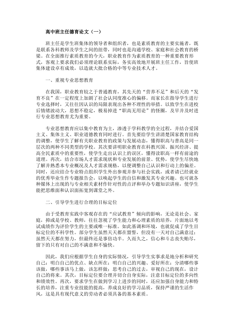 高中班主任德育论文(一)班主任是学生班集体的领导者和组织者,也是素质教育的主要实施者,既是联系各科教师及学生之间的纽带,同时也是沟通学校、家庭和社会教育的桥梁。在全面推行素质教育的今天,职业教育作为素质教育的一种重要教育形式,客观上要求我们必须理论联系实际,务实高效地开展班主任工作,旨使班集体建设卓有成效,以造就大批合格的中等专业技术人才。一、重视专业思想教育在我国,职业教育较之于普通教育,其先天的“营养不足”和后天的“发育不良”在一定程度上加剧了社会认同度准心的偏移。而家长在指导学生进行专业选择时,又往往因认识的局限表现出各种不理性的举措。以致学生在进校后情绪波动大,思想不稳定,极易掉进“职高无用论”的怪圈,及早并及时进行专业思想教育尤为重要。专业思想教育应以集中教育为主,渗透于学科教学的全过程,并结合爱国主义、集体主义、职业道德教育同时进行。首先要给学生讲清楚国家教育结构的调整,使学生了解有关职业教育的政策与发展动态,懂得职高与普高是同层次的两种不同类型的学校。其次要讲明职业教育在科教兴国、振兴经济、提高全民素质中的重要性,使学生走出认识上的误区,懂得读职高一样有前途的道理。再次,结合市场人才需求现状和专业发展的前景、优势,使学生尽快地了解并熟悉本专业概况及人才需求规格,以便调整自己认识和行动上的偏差。同时,还应结合专业特点组织学生外出参观并参与社会实践,或者请已经就业的优秀毕业生作专题报告会,以唤起学生的自信和激发其专业兴趣。也可就各种媒体上出现的与专业相关素材作针对性的点评和举办专题知识讲座,使学生能把思维面和认识面拓宽到课堂之外。二、引导学生进行合理的目标定位由于受教育实践中客观存在的“应试教育”倾向的影响,无论是社会、家庭,抑或是学校、教师,往往忽视了学生能力和心理素质的培养,片面地以考试成绩作为评价学生的主要或唯一标准。如此基调和环境,也就促成了学生目标定位的不科学性。部分学生虽然天天都在盟誓,但没有一天对自己满意过:虽然天天都在努力,但最终还是事倍功半。久而久之,信心和斗志丧失贻尽,留下的只有对自己的不满意和不愉快。因此,我们应根据学生自身的实际情况,引导学生实事求是地分析和研究自己:明白自己的优点、缺点所在;明白自己的兴趣、爱好所在:分清哪些事该做,哪些事该马上做,该怎样做:思考自己的过去,审视自己的现在,设计自己的将来。其次,目标定位要合理并切合自身实际,注意目标定位的多向性和绩效性。再次,要求学生在做到学习上进步的同时,还应加强自身能力和特长的培养,注重专业技能的提高,养成良好的学习品质,保持严谨的生活作风,这是具有现代意义的劳动者必须具备的基本素质。