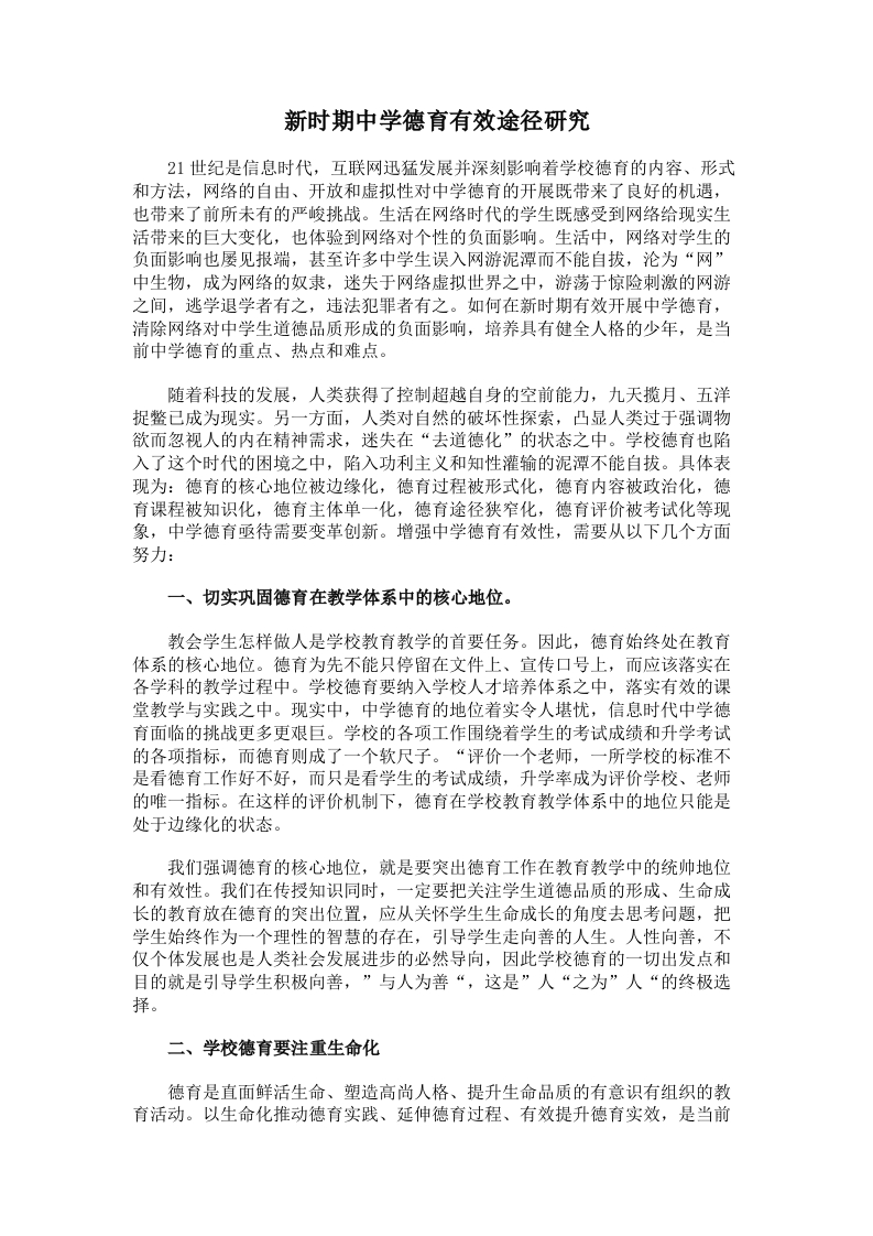 新时期中学德育有效途径研究21世纪是信息时代,互联网迅猛发展并深刻影响着学校德育的内容、形式和方法,网络的自由、开放和虚拟性对中学德育的开展既带来了良好的机遇,也带来了前所未有的严峻挑战。生活在网络时代的学生既感受到网络给现实生活带来的巨大变化,也体验到网络对个性的负面影响。生活中,网络对学生的负面影响也屡见报端,甚至许多中学生误入网游泥潭而不能自拔,沦为“网”中生物,成为网络的奴隶,迷失于网络虚拟世界之中,游荡于惊险刺激的网游之间,逃学退学者有之,违法犯罪者有之。如何在新时期有效开展中学德育,清除网络对中学生道德品质形成的负面影响,培养具有健全人格的少年,是当前中学德育的重点、热点和难点。随着科技的发展,人类获得了控制超越自身的空前能力,九天揽月、五洋捉整已成为现实。另一方面,人类对自然的破坏性探索,凸显人类过于强调物欲而忽视人的内在精神需求,迷失在“去道德化”的状态之中。学校德育也陷入了这个时代的困境之中,陷入功利主义和知性灌输的泥潭不能自拔。具体表现为:德育的核心地位被边缘化,德育过程被形式化,德育内容被政治化,德育课程被知识化,德育主体单一化,德育途径狭窄化,德育评价被考试化等现象,中学德育亟待需要变革创新。增强中学德育有效性,需要从以下几个方面努力:一、切实巩固德育在教学体系中的核心地位。教会学生怎样做人是学校教育教学的首要任务。因此,德育始终处在教育体系的核心地位。德育为先不能只停留在文件上、宣传口号上,而应该落实在各学科的教学过程中。学校德育要纳入学校人才培养体系之中,落实有效的课堂教学与实践之中。现实中,中学德育的地位着实令人堪忧,信息时代中学德育面临的挑战更多更艰巨。学校的各项工作围绕着学生的考试成绩和升学考试的各项指标,而德育则成了一个软尺子。“评价一个老师,一所学校的标准不是看德育工作好不好,而只是看学生的考试成绩,升学率成为评价学校、老师的唯一指标。在这样的评价机制下,德育在学校教育教学体系中的地位只能是处于边缘化的状态。我们强调德育的核心地位,就是要突出德育工作在教育教学中的统帅地位和有效性。我们在传授知识同时,一定要把关注学生道德品质的形成、生命成长的教育放在德育的突出位置,应从关怀学生生命成长的角度去思考问题,把学生始终作为一个理性的智慧的存在,引导学生走向善的人生。人性向善,不仅个体发展也是人类社会发展进步的必然导向,因此学校德育的一切出发点和目的就是引导学生积极向善,”与人为善“,这是”人“之为”人“的终极选择。二、学校德育要注重生命化德育是直面鲜活生命、塑造高尚人格、提升生命品质的有意识有组织的教育活动。以生命化推动德育实践、延伸德育过程、有效提升德育实效,是当前
