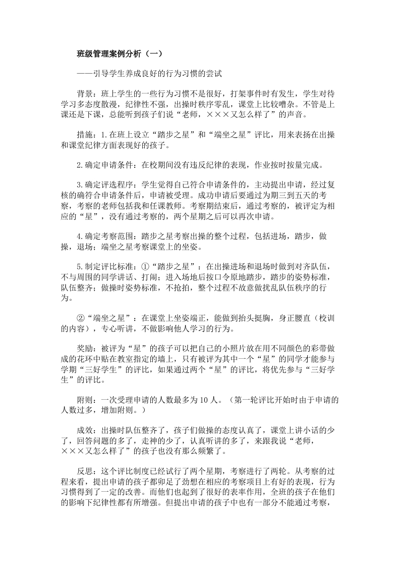 班级管理案例分析(一)一一引导学生养成良好的行为习惯的尝试背景:班上学生的一些行为习惯不是很好,打架事件时有发生,学生对待学习多态度散漫,纪律性不强,出操时秩序零乱,课堂上比较嘈杂。不管是上课还是下课,总能听到孩子们说“老师,×××又怎么样了”的声音。措施:1.在班上设立“踏步之星”和“端坐之星”评比,用来表扬在出操和课堂纪律方面表现好的孩子。2.确定申请条件:在校期间没有违反纪律的表现,作业按时按量完成。3.确定评选程序:学生觉得自己符合申请条件的,主动提出申请,经过复核的确符合申请条件后,申请被受理。成功申请后要通过为期三到五天的考察,考察的老师包括我和任课教师。考察期结束后,通过考察的,被评定为相应的“星”,没有通过考察的,两个星期之后可以再次申请。4.确定考察范围:踏步之星考察出操的整个过程,包括进场,踏步,做操,退场:端坐之星考察课堂上的坐姿。5.制定评比标准:①“踏步之星”:在出操进场和退场时做到对齐队伍,不与周围的同学讲话、打闹:进入场地后按口令原地踏步,踏步的姿势标准,队伍整齐:做操时姿势标准,不抢拍,整个过程不故意做扰乱队伍秩序的行为。②“端坐之星”:在课堂上坐姿端正,能做到抬头挺胸,身正腰直(校训的内容),专心听讲,不做影响他人学习的行为。奖励:被评为“星”的孩子可以把自己的小照片放在用不同颜色的彩带做成的花环中贴在教室指定的墙上,只有被评为其中一个“星”的同学才能参与学期“三好学生”的评比,如果通过两个“星”的评比,将优先参与“三好学生”的评比。附则:一次受理申请的人数最多为10人。(第一轮评比开始时由于申请的人数过多,增加附则。)成效:出操时队伍整齐了,孩子们做操的态度认真了,课堂上讲小话的少了,回答问题的多了,走神的少了,认真听讲的多了,来跟我说“老师,××X又怎么样了”的孩子也没有那么频繁了。反思:这个评比制度已经试行了两个星期,考察进行了两轮。从考察的过程来看,提出申请的孩子都卯足了劲想在相应的考察项目上有好的表现,行为习惯得到了一定的改善。而他们也起到了很好的表率作用,全班的孩子在他们的影响下纪律性都有所增强。但提出申请的孩子中也有一部分不能通过考察,