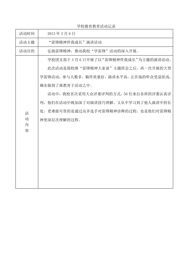 学校德育教育活动记录活动时间2013年3月6日活动主题“雷锋精神伴我成长”演讲活动活动目的弘扬雷锋精神,推动我校“学雷锋”活动的深入开展。学校团支部于3月6日开展了以“雷锋精神伴我成长”为主题的演讲活动。此次活动是我校继“雷锋精神大家谈”主题班会之后,再一次开展的大型学雷锋活动,参与人数多,稿件质量好,演讲水平高,让在场的听众受益匪浅,确实做到了寓教育于活动之中。活动中,我校首次采用大众评委评判的方式,50位来自各班的评委认真评判,他们在活动中既加深了对演讲技巧理解,又从中学习到了他人演讲中的长处,更难能可贵的是通过众多选手对雷锋精神诠释的过程,也是他们对雷锋精动神更深层次理解的过程。容