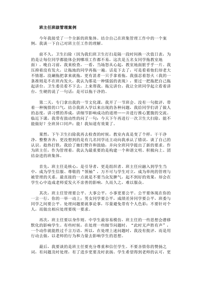 班主任班级管理案例今年我接受了一个全新的班集体。结合自己在班集管理工作中的一个案例,我谈一下自己对班主任工作的理解。前不久,卫生扫除(因为我们班卫生打扫是隔一段时间换一次值日表,为的是让每位同学都能体会到哪项工作都不易,这次是五名女同学拖教室地面)。晚自习前,我来检查,一看,当场怒从心起,教室地面脏乎乎一片。我压抑着没有发火,让拖地的同学再拖一遍。话是下去了,可是看着他们却老大不情愿,没涮拖把拿来就拖,更有甚者一只手拿着拖。我强忍着怒火(我的条准则是不在班内发火,我认为那是一种惴弱的表现),要过一把拖把自己拖起讲台。卫生委员看不下去,上来帮我。拖完讲台,我让全班同学起立看着讲台,生硬的说了一句话:是可以拖干净的。第二天,专门拿出我的一节文化课,我开了一节班会。没有一句批评,带着一种惋惜的口气,结合我班入学以来出现的各种问题,我给同学们讲了做人的态度,讲习惯的养成,讲细节影响成功的道理…并进行推心置腹的交流。临近下课,我带有鼓动性的问了一句:今天下午再进行一次卫生大扫除,能不能做好?全班异口同声:能!我知道有效果了。果然,下午卫生扫除我再去检查的时候,教室内真是变了个样,干干净净,整整齐齐:更没想到的是有几名同学还主动向我承认了错误,谈了自己的认识。趁热打铁,我给了她们赞许和鼓励,并向全班同学提出了新的要求。作为班主任,作为管理着,我认为最重要的是构建一个和谐文明、积极向上、团结奋进的班集体。首先,班主任是核心,是引导者,更是组织者。班主任应融入到学生当中,成为学生信服、尊敬的“领袖”,万不可与学生对立,成为单纯的管理与被管理的关系。最直接的一点就是不要当众发脾气,起不到好的效果,却会在学生心中造成老师爱发火不亲善的影响,久而久之,难以服众。其次,班主任管理要公平。大事公平,小事更要公平。公平要体现在你的一言一行,你的一举一动上;男女同学要公平,成绩差异同学要公平,班委与同学之间要公平。处理问题要就事论事,尽量避免带有个人色彩:不要针对个人,而做出相应处理要统一要求。再次,班主任要以身作则。中学生最容易模仿,班主任的一些思想会潜移默化的影响学生。有些时候,在处理一些细节问题时,“此时无声胜有声”,一个动作就能胜过千言万语,所以,在处理上述问题时,我没有批评,而是用行动去做,以老师的行为和力量去影响学生的思想。最后,我要谈的是班主任要充分尊重和信任学生。不要吝惜你的赞扬之词,有问题及时处理,有了进步更要及时表扬。学生希望得到老师的认可,更