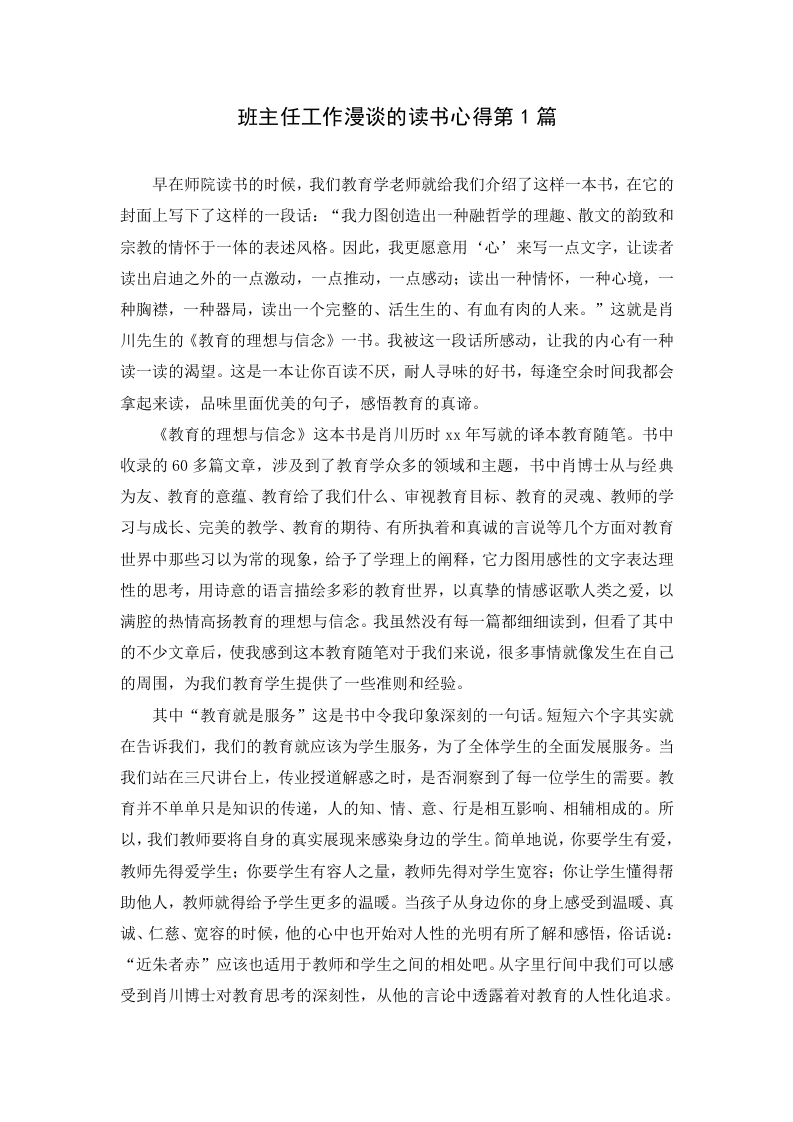 班主任工作漫谈的读书心得第1篇早在师院读书的时候,我们教育学老师就给我们介绍了这样一本书,在它的封面上写下了这样的一段话:“我力图创造出一种融哲学的理趣、散文的韵致和宗教的情怀于一体的表述风格。因此,我更愿意用‘心’来写一点文字,让读者读出启迪之外的一点激动,一点推动,一点感动:读出一种情怀,一种心境,一种胸襟,一种器局,读出一个完整的、活生生的、有血有肉的人来。”这就是肖川先生的《教育的理想与信念》一书。我被这一段话所感动,让我的内心有一种读一读的渴望。这是一本让你百读不厌,耐人寻味的好书,每逢空余时间我都会拿起来读,品味里面优美的句子,感悟教育的真谛。《教育的理想与信念》这本书是肖川历时xx年写就的译本教育随笔。书中收录的60多篇文章,涉及到了教育学众多的领域和主题,书中肖博士从与经典为友、教育的意蕴、教育给了我们什么、审视教育目标、教育的灵魂、教师的学习与成长、完美的教学、教育的期待、有所执着和真诚的言说等几个方面对教育世界中那些习以为常的现象,给予了学理上的阐释,它力图用感性的文字表达理性的思考,用诗意的语言描绘多彩的教育世界,以真挚的情感讴歌人类之爱,以满腔的热情高扬教育的理想与信念。我虽然没有每一篇都细细读到,但看了其中的不少文章后,使我感到这本教育随笔对于我们来说,很多事情就像发生在自己的周围,为我们教育学生提供了一些准则和经验。其中“教育就是服务”这是书中令我印象深刻的一句话。短短六个字其实就在告诉我们,我们的教育就应该为学生服务,为了全体学生的全面发展服务。当我们站在三尺讲台上,传业授道解惑之时,是否洞察到了每一位学生的需要。教育并不单单只是知识的传递,人的知、情、意、行是相互影响、相辅相成的。所以,我们教师要将自身的真实展现来感染身边的学生。简单地说,你要学生有爱,教师先得爱学生:你要学生有容人之量,教师先得对学生宽容:你让学生懂得帮助他人,教师就得给予学生更多的温暖。当孩子从身边你的身上感受到温暖、真诚、仁慈、宽容的时候,他的心中也开始对人性的光明有所了解和感悟,俗话说:“近朱者赤”应该也适用于教师和学生之间的相处吧。从字里行间中我们可以感受到肖川博士对教育思考的深刻性,从他的言论中透露着对教育的人性化追求。