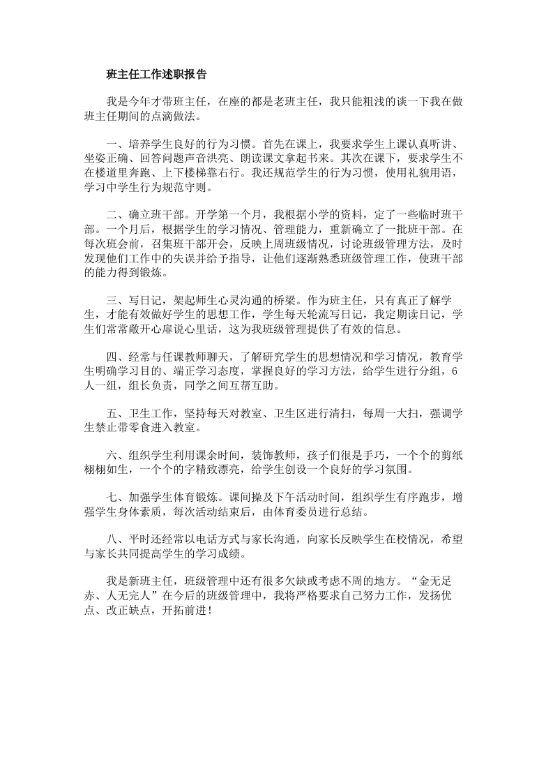 班主任工作述职报告我是今年才带班主任,在座的都是老班主任,我只能粗浅的谈一下我在做班主任期间的点滴做法。一、培养学生良好的行为习惯。首先在课上,我要求学生上课认真听讲、坐姿正确、回答问题声音洪亮、朗读课文拿起书来。其次在课下,要求学生不在楼道里奔跑、上下楼梯靠右行。我还规范学生的行为习惯,使用礼貌用语,学习中学生行为规范守则。二、确立班干部。开学第一个月,我根据小学的资料,定了一些临时班干部。一个月后,根据学生的学习情况、管理能力,重新确立了一批班干部。在每次班会前,召集班干部开会,反映上周班级情况,讨论班级管理方法,及时发现他们工作中的失误并给予指导,让他们逐渐熟悉班级管理工作,使班干部的能力得到锻炼。三、写日记,架起师生心灵沟通的桥梁。作为班主任,只有真正了解学生,才能有效做好学生的思想工作,学生每天轮流写日记,我定期读日记,学生们常常敞开心扉说心里话,这为我班级管理提供了有效的信息。四、经常与任课教师聊天,了解研究学生的思想情况和学习情况,教育学生明确学习目的、端正学习态度,掌握良好的学习方法,给学生进行分组,6人一组,组长负责,同学之间互帮互助。五、卫生工作,坚持每天对教室、卫生区进行清扫,每周一大扫,强调学生禁止带零食进入教室。六、组织学生利用课余时间,装饰教师,孩子们很是手巧,一个个的剪纸栩栩如生,一个个的字精致漂亮,给学生创设一个良好的学习氛围。七、加强学生体育锻炼。课间操及下午活动时间,组织学生有序跑步,增强学生身体素质,每次活动结束后,由体育委员进行总结。八、平时还经常以电话方式与家长沟通,向家长反映学生在校情况,希望与家长共同提高学生的学习成绩。我是新班主任,班级管理中还有很多欠缺或考虑不周的地方。“金无足赤、人无完人”在今后的班级管理中,我将严格要求自己努力工作,发扬优点、改正缺点,开拓前进!