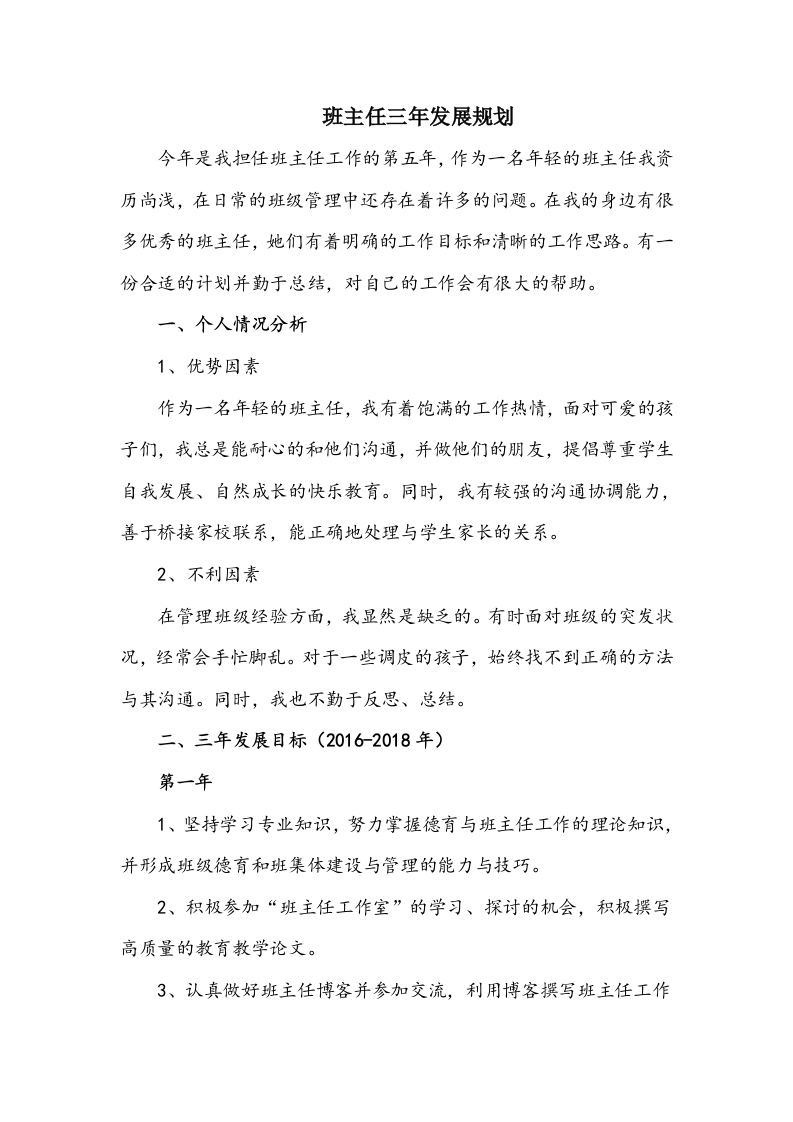 班主任三年发展规划今年是我担任班主任工作的第五年,作为一名年轻的班主任我资历尚浅,在日常的班级管理中还存在着许多的问题。在我的身边有很多优秀的班主任,她们有着明确的工作目标和清晰的工作思路。有一份合适的计划并勤于总结,对自己的工作会有很大的帮助。一、个人情况分析1、优势因素作为一名年轻的班主任,我有着饱满的工作热情,面对可爱的孩子们,我总是能耐心的和他们沟通,并做他们的朋友,提倡尊重学生自我发展、自然成长的快乐教育。同时,我有较强的沟通协调能力,善于桥接家校联系,能正确地处理与学生家长的关系。2、不利因素在管理班级经验方面,我显然是缺乏的。有时面对班级的突发状况,经常会手忙脚乱。对于一些调皮的孩子,始终找不到正确的方法与其沟通。同时,我也不勤于反思、总结。二、三年发展目标(20162018年)第一年1、坚持学习专业知识,努力掌握德育与班主任工作的理论知识,并形成班级德育和班集体建设与管理的能力与技巧。2、积极参加“班主任工作室”的学习、探讨的机会,积极撰写高质量的教育教学论文。3、认真做好班主任博客并参加交流,利用博客撰写班主任工作