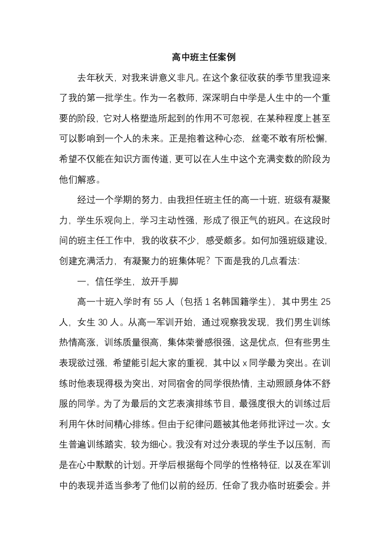 高中班主任案例去年秋天,对我来讲意义非凡。在这个象征收获的季节里我迎来了我的第一批学生。作为一名教师,深深明白中学是人生中的一个重要的阶段,它对人格塑造所起到的作用不可忽视,在某种程度上甚至可以影响到一个人的未来。正是抱着这种心态,丝毫不敢有所松懈,希望不仅能在知识方面传道,更可以在人生中这个充满变数的阶段为他们解惑。经过一个学期的努力,由我担任班主任的高一十班,班级有凝聚力,学生乐观向上,学习主动性强,形成了很正气的班风。在这段时间的班主任工作中,我的收获不少,感受颇多。如何加强班级建设,创建充满活力,有凝聚力的班集体呢?下面是我的几点看法:一,信任学生,放开手脚高一十班入学时有55人(包括1名韩国籍学生),其中男生25人,女生30人。从高一军训开始,通过观察我发现,我们男生训练热情高涨,训练质量很高,集体荣誉感很强,这是优点,但有些男生表现欲过强,希望能引起大家的重视,其中以×同学最为突出。在训练时他表现得极为突出,对同宿舍的同学很热情,主动照顾身体不舒服的同学。为了为最后的文艺表演排练节目,最强度很大的训练过后利用午休时间精心排练。但由于纪律问题被其他老师批评过一次。女生普遍训练踏实,较为细心。我没有对过分表现的学生予以压制,而是在心中默默的计划。开学后根据每个同学的性格特征,以及在军训中的表现并适当参考了他们以前的经历,任命了我办临时班委会。并