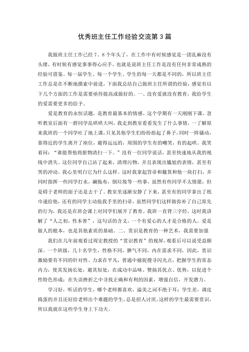 优秀班主任工作经验交流第3篇我做班主任工作已经7、8个年头了,在工作中有时候感觉是一团乱麻没有头绪,有时候有感觉事事得心应手,也就是说班主任工作是没有任何非常成熟的经验可借鉴。每一届学生、每一个学生、学生的每一天都是不同的,所以班主任工作总是在不断地摸索中前进,下面我总结自己做班主任所谓的经验,感觉有以下几个方面的工作是需要亟待提高或做好的。一、没有爱就没有教育,我给学生的爱需要更多的给予。爱是教育的永恒话题,是教育最基本的情感。这个学期有一天刚刚下课,忽听教室后面有一群同学乱哄哄大叫,我走到教室看看发生了什么事情,一了解原来我班的一个同学吐了地上课,只见其他学生们纷纷捂起了鼻子,同时一阵骚动,靠得近的学生离开了座位,避得远远的,周围的学生有的嘲笑,有的起哄。我笑着问:“谁能帮他将脏物清扫一下。”没有一位同学说话,甚至快速地从我的视线中消失。这位同学自己站了起来,清理污物,并且表现出尴尬的表情,甚至有哭的冲动。我心里明白它为什么这样。这时我拿起笤帚和簸箕和他一块打扫,并同时指挥一些同学打水,涮拖布,倒垃圾等一些事,虽然有些同学不太情愿,但是碍于老师的面子还是去干了。教室里逐渐安静了下来,甚至有的同学拿出了纸巾递给他,还有的同学主动抢我手里的扫帚,虽然同学们这样做弥补了自己原先的行为,我还是在班会课上对同学们展开了教育。我班一直背三字经,这时我讲解了“人之初,性本善”,这句话的含义,一个有爱心的人才是合格的人。爱是做人的根本,也是其他素质的基础。二、赏识是教育的一种艺术,我需要加强我们在几年前观看过周宏教授的“赏识教育”的视屏,观看后可以说受益颇深。一个班级,几十名学生,性格不同,脾气不同,内在需求不同,因此,赏识激励要有不同的针对性。力求在平凡,普通中捕捉搜寻闪光点,把握学生的常态内力,使其发扬长处,避其短处,在成功中品味、赞扬其优点、优势,以促进个性特色形成:在失误挫折之中寻找正确和有利的因素,增强自信,开发潜力。学习好,听话的学生,哪个老师都喜欢,溢美之词不绝于耳:学生差,调皮捣蛋的并且还好给老师出个难题的学生,总是招人讨厌。这样的学生最需要赏识,所以我就在这些学生身上下功夫。