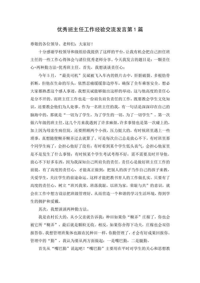 优秀班主任工作经验交流发言第1篇尊敬的各位领导、老师们:大家好!十分感谢学校领导和级组给我提供了这样的平台,让我有机会把自己担任班主任的一些工作心得体会与诸位优秀老师分享。今天我发言的题目是:一颗责任心+两种勤方法=优秀班主任。首先,我想谈谈责任心:今年5月,“最美司机”吴斌被飞入车内的铁片击中,肝脏破裂、多根肋骨折断,但他在生命的尽头,依然忍痛缓缓靠边停车,确保了全车乘客安全。想必大家都熟悉这个感人事迹,我想吴斌能够做出这样的举动,这与他高度的责任心是分不开的。而班主任工作也是一份肩负肩负责任的工作,既要教会学生文化知识,还要教会他们为人处事。作为一名班主任的我,有一句话是深深印在自己的脑海中的,那就是“一切为了学生,为了学生的一切,为了一切学生”。第一次做六年级的班主任,这几个月来我遇到了许多麻烦,许多事情也是第一次碰上的,加上因为母亲生病住院,还要照顾两个小孩,压力挺大的,有时候班里遇上一些琐事,真想随便糊弄糊弄过去就算了。可是每次自己总是放心不下,有时班里那个同学生病了,会担心他好了没有:有时看到某个学生低头丧气,会担心他家里是不是发生了什么事情:有时候某个学生考试考得不好,需不需要及时开导他。放心不下好多东西,因为我深知自己所肩负的责任。责任心是做好班主任工作的前提,有了高度的责任心,才能真正做到:把别人的孩子当作自己的孩子来教,关爱学生,关注学生的前途命运。这样才能把教书育人的工作做扎实。只要有了高度的责任心,树立“班兴我荣,班落我耻,以班为家,荣耻与共”的意识,就会在工作中想方设法把班级管理好,从而营造一个和谐的学习生活环境,得到学生的拥护和爱戴。其次,我想谈谈两种勤方法。我是农村长大的,从小父亲就告诉我:种田如果你“糊弄”庄稼了,你也会被它所“糊弄”,最后就是颗粒无收。相反,如果你舍得下功夫,庄稼也会双倍报答你。我想管理班集体也跟农民种田一样,你勤管理了,才会有好成果回报你。管理中的“勤”,我认为要从两方面做起:一是嘴巴勤,二是腿勤。首先从“嘴巴勤”说起吧!“嘴巴勤”主要用在平时对学生的关心和思想教
