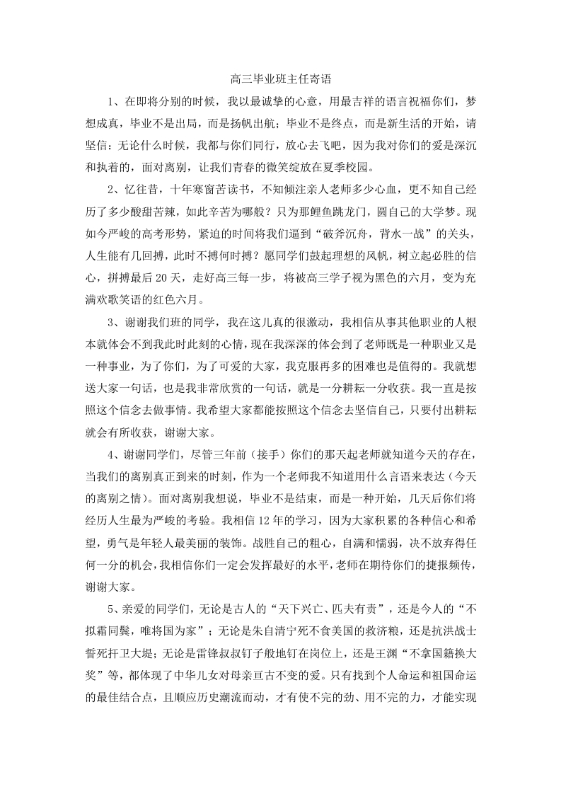 高三毕业班主任寄语1、在即将分别的时候,我以最诚挚的心意,用最吉祥的语言祝福你们,梦想成真,毕业不是出局,而是扬帆出航:毕业不是终点,而是新生活的开始,请坚信:无论什么时候,我都与你们同行,放心去飞吧,因为我对你们的爱是深沉和执着的,面对离别,让我们青春的微笑绽放在夏季校园。2、忆往昔,十年寒窗苦读书,不知倾注亲人老师多少心血,更不知自己经历了多少酸甜苦辣,如此辛苦为哪般?只为那鲤鱼跳龙门,圆自己的大学梦。现如今严峻的高考形势,紧迫的时间将我们逼到“破斧沉舟,背水一战”的关头,人生能有几回搏,此时不搏何时搏?愿同学们鼓起理想的风帆,树立起必胜的信心,拼搏最后20天,走好高三每一步,将被高三学子视为黑色的六月,变为充满欢歌笑语的红色六月。3、谢谢我们班的同学,我在这儿真的很激动,我相信从事其他职业的人根本就体会不到我此时此刻的心情,现在我深深的体会到了老师既是一种职业又是一种事业,为了你们,为了可爱的大家,我克服再多的困难也是值得的。我就想送大家一句话,也是我非常欣赏的一句话,就是一分耕耘一分收获。我一直是按照这个信念去做事情。我希望大家都能按照这个信念去坚信自己,只要付出耕耘就会有所收获,谢谢大家。4、谢谢同学们,尽管三年前(接手)你们的那天起老师就知道今天的存在,当我们的离别真正到来的时刻,作为一个老师我不知道用什么言语来表达(今天的离别之情)。面对离别我想说,毕业不是结束,而是一种开始,几天后你们将经历人生最为严峻的考验。我相信12年的学习,因为大家积累的各种信心和希望,勇气是年轻人最美丽的装饰。战胜自己的粗心,自满和惴弱,决不放弃得任何一分的机会,我相信你们一定会发挥最好的水平,老师在期待你们的捷报频传,谢谢大家。5、亲爱的同学们,无论是古人的“天下兴亡、匹夫有责”,还是今人的“不拟霜同鬓,唯将国为家”;无论是朱自清宁死不食美国的救济粮,还是抗洪战士誓死扦卫大堤:无论是雷锋叔叔钉子般地钉在岗位上,还是王渊“不拿国籍换大奖”等,都体现了中华儿女对母亲亘古不变的爱。只有找到个人命运和祖国命运的最佳结合点,且顺应历史潮流而动,才有使不完的劲、用不完的力,才能实现
