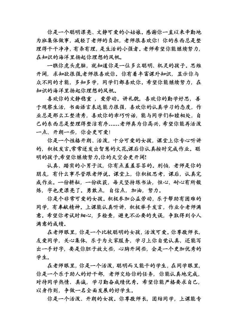 你是一个聪明漂亮、文静可爱的小姑娘。感谢你一直以来辛勤地为班集体做事,减轻了老师的负担,老师很喜欢你!你的东西总是整理得干干净净,有条有理,是生活的小强者。老师希望你能继续努力,在知识的海洋里扬起你理想的风帆。一瞧你虎头虎脑,就知道你是一位多么聪明、机灵的孩子。思维开阔,求知欲很强,老师很喜欢你。你有着丰富课外知识,显示你与众不同的才能,多知多学,同学们都喜欢你。希望你能继续努力,在知识的海洋里扬起你理想的风帆。喜欢你的文静稳重,爱劳动。讲礼貌,喜欢你的勤学好思,善于观察生活,书面语言表达能力很强,喜欢你的认真学习的态度,作业总是那么工整清秀,喜欢你的乖巧听话,能与同学们和睦相处,自己的东西总是整理得整洁有序…老师真为你高兴,希望你能再活泼一点、开朗一些,你会更可爱!你是一个性格开朗、活泼,十分可爱的女孩,课堂上你专心听讲的,积极发言,常常迸发出智慧的火花,课后你认真按时完成作业。聪明的孩子,希望你继续努力,你的天空会更开阔!认真、踏实的小男子汉,你有点羞羞答答的。别怕,老师是你的朋友,有什么事尽管跟老师说。课堂上,你积极思考,课后,认真完成作业。一份耕耘,一份收获,每天坚持练书法,恒心、耐心有所锻炼,字也更漂亮了。勇敢点,自信,点,加油,努力。你是个非常可爱的女孩。积极参加公益劳动,乐于帮助有困难的同学,有奉献精神。上课能认真听讲,积极举手发言,作业令老师满意。希望你考试时细心,多检查,避免不必要的失误,争取得到令人满意的成绩。在老师眼里,你是一个比较聪明的女孩,活泼可爱。你尊敬师长,友爱同学,关心集体,乐于为大家服务,学习上你自觉认真,还能写出一手好字,要是你胆子放大些,心胸开阔些,会是一个更加优秀的学生。在老师眼里,你是一个活泼,聪明而又能干的学生,在同学眼里,你是一个乐于助人的好干部,老师交给你的任务,你能认真地完成,对待同学热情、真诚,学习勤奋成绩优秀。希望你能严格要求自己,以身作则,争做一名全面发展的好学生。你是一个活泼、开朗的女孩。你尊敬师长,团结同学,上课能专