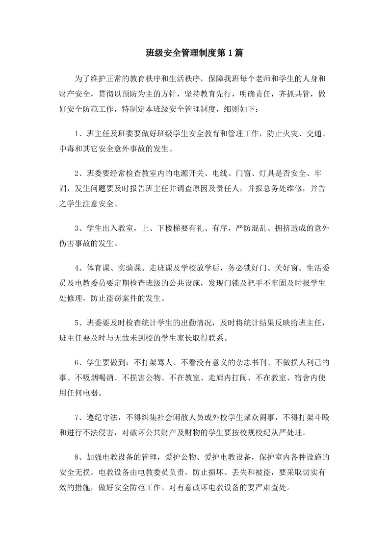 班级安全管理制度第1篇为了维护正常的教育秩序和生活秩序,保障我班每个老师和学生的人身和财产安全,贯彻以预防为主的方针,坚持教育先行,明确责任,齐抓共管,做好安全防范工作,特制定本班级安全管理制度,细则如下:1、班主任及班委要做好班级学生安全教育和管理工作,防止火灾、交通、中毒和其它安全意外事故的发生。2、班委要经常检查教室内的电源开关、电线、门窗、灯具是否安全、牢固,发生问题要及时报告班主任并调查原因及责任人,并报总务处维修,并告之学生注意安全。3、学生出入教室,上、下楼梯要有礼、有序,严防混乱、拥挤造成的意外伤害事故的发生4、体育课、实验课、走班课及学校放学后,务必锁好门、关好窗。生活委员及电教委员要定期检查班级的公共设施,发现门锁及把手不牢固及时报学生处修理,防止盗窃案件的发生。5、班委要及时检查统计学生的出勤情况,及时将统计结果反映给班主任,班主任要及时与无故未到校的学生家长取得联系。6、学生要做到:不打架骂人、不看没有意义的杂志书刊、不做损人利己的事、不吸烟喝酒、不损害公物、不在教室、走廊内打闹、不在教室、宿舍内使用任何电器。7、遵纪守法,不得纠集社会闲散人员或外校学生聚众闹事,不得打架斗殴和进行不法侵害,对破坏公共财产及财物的学生要按校规校纪从严处理。8、加强电教设备的管理,爱护公物、爱护电教设备,保护室内各种设施的安全无损。电教设备由电教委员负责,防止损坏、丢失和被盗,要采取切实有效的措施,做好安全防范工作。对有意破坏电教设备的要严肃查处。