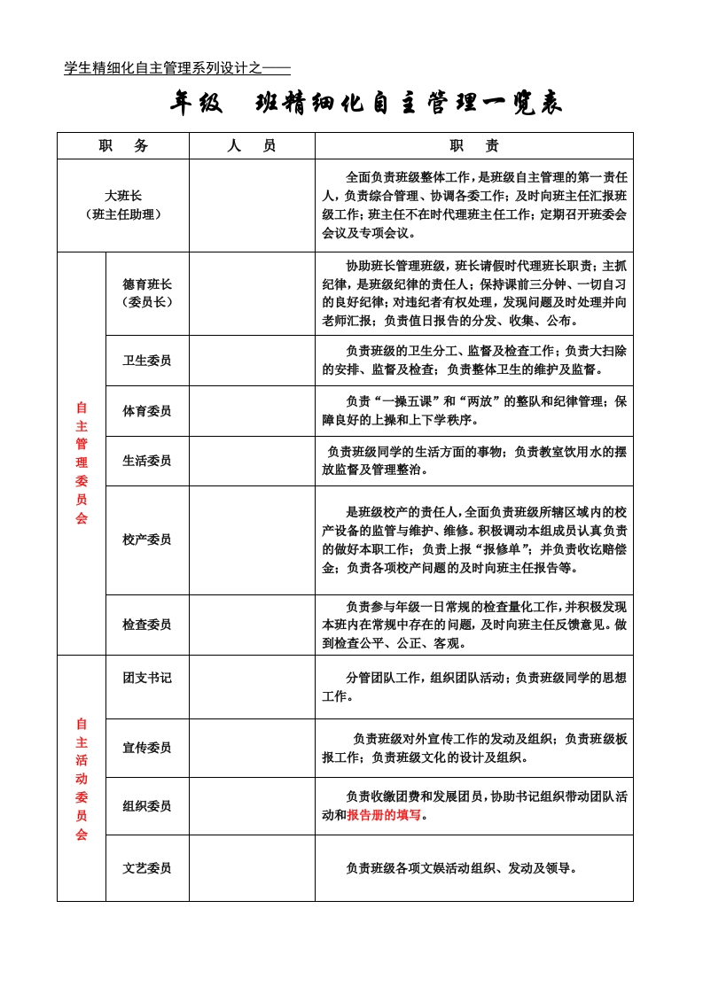 学生精细化自主管理系列设计之—年级班精细化自主管理一览表职务人员职责全面负责班级整体工作,是班级自主管理的第一责任大班长人,负责综合管理、协调各委工作;及时向班主任汇报班(班主任助理)级工作:班主任不在时代理班主任工作;定期召开班委会会议及专项会议。协助班长管理班级,班长请假时代理班长职贵;主抓德有班长纪律,是班级纪律的贵任人;保持课前三分钟、一切自习(委员长)的良好纪律:对违纪者有权处理,发现问题及时处理并向老师汇报:负责值日报告的分发、收集、公布。负责班级的卫生分工、监督及检查工作:负责大扫除卫生委员的安排、监督及检查;负贵整体卫生的维护及监督。负责“一操五课”和“两放”的整队和纪律管理;保体育委员障良好的上操和上下学秩序。管负贵班级同学的生活方面的事物:负责教室饮用水的摆理生活委员放监督及管理整治。委会是班级校产的责任人,全面负贵班级所辖区域内的校产设备的监管与维护、维修。积极调动本组成员认真负贵校产委员的做好本职工作;负责上报“报修单”;并负责收讫赔偿金:负责各项校产问题的及时向班主任报告等。负责参与年级一日常规的检查量化工作,并积极发现检查委员本班内在常规中存在的问题,及时向班主任反馈意见。做到检查公平、公正、客观。团支书记分管团队工作,组织团队活动;负责班级同学的思想工作。自主宣宜传委员负责班级对外宣传工作的发动及组织:负责班级板报工作;负责班级文化的设计及组织。动委负贵收缴团费和发展团员,协助书记组织带动团队活组织委员动和报告册的填写。会文艺委员负贵班级各项文娱活动组织、发动及领导。