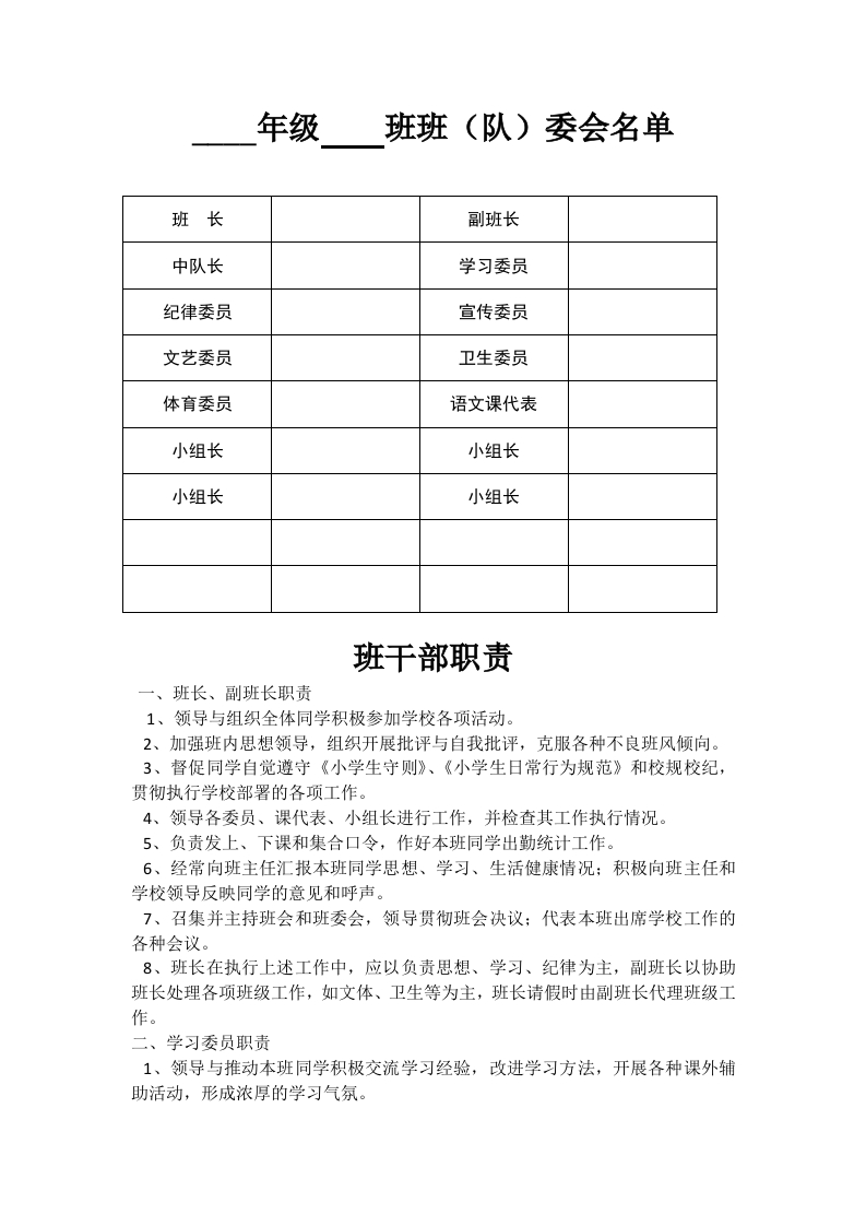 年级班班(队)委会名单班长副班长中队长学习委员纪律委员宣传委员文艺委员卫生委员体育委员语文课代表小组长小组长小组长小组长班干部职责一、班长、副班长职责1、领导与组织全体同学积极参加学校各项活动。2、加强班内思想领导,组织开展批评与自我批评,克服各种不良班风倾向。3、督促同学自觉遵守《小学生守则》、《小学生日常行为规范》和校规校纪,贯彻执行学校部署的各项工作。4、领导各委员、课代表、小组长进行工作,并检查其工作执行情况。5、负责发上、下课和集合口令,作好本班同学出勤统计工作。6、经常向班主任汇报本班同学思想、学习、生活健康情况:积极向班主任和学校领导反映同学的意见和呼声。7、召集并主持班会和班委会,领导贯彻班会决议:代表本班出席学校工作的各种会议。8、班长在执行上述工作中,应以负责思想、学习、纪律为主,副班长以协助班长处理各项班级工作,如文体、卫生等为主,班长请假时由副班长代理班级工作。二、学习委员职责1、领导与推动本班同学积极交流学习经验,改进学习方法,开展各种课外辅助活动,形成浓厚的学习气氛。
