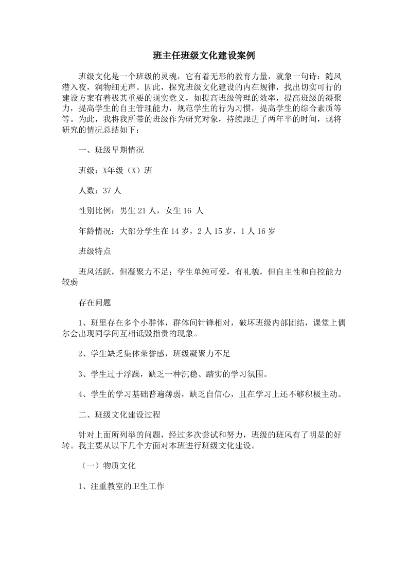 班主任班级文化建设案例班级文化是一个班级的灵魂,它有着无形的教育力量,就象一句诗:随风潜入夜,润物细无声。因此,探究班级文化建设的内在规律,找出切实可行的建设方案有着极其重要的现实意义,如提高班级管理的效率,提高班级的凝聚力,提高学生的自主管理能力,规范学生的行为习惯,提高学生的综合素质等等。为此,我将我所带的班级作为研究对象,持续跟进了两年半的时间,现将研究的情况总结如下:一、班级早期情况班级:X年级(X)班人数:37人性别比例:男生21人,女生16人年龄情况:大部分学生在14岁,2人15岁,1人16岁班级特点班风活跃,但凝聚力不足:学生单纯可爱,有礼貌,但自主性和自控能力较弱存在问题1、班里存在多个小群体,群体间针锋相对,破坏班级内部团结,课堂上偶尔会出现同学间互相诋毁指责的现象。2、学生缺乏集体荣誉感,班级凝聚力不足3、学生过于浮躁,缺乏一种沉稳、踏实的学习氛围。4、学生的学习基础普遍薄弱,缺乏自信心,且在学习上还不够积极主动。二、班级文化建设过程针对上面所列举的问题,经过多次尝试和努力,班级的班风有了明显的好转。我主要从以下几个方面对本班进行班级文化建设。(一)物质文化1、注重教室的卫生工作