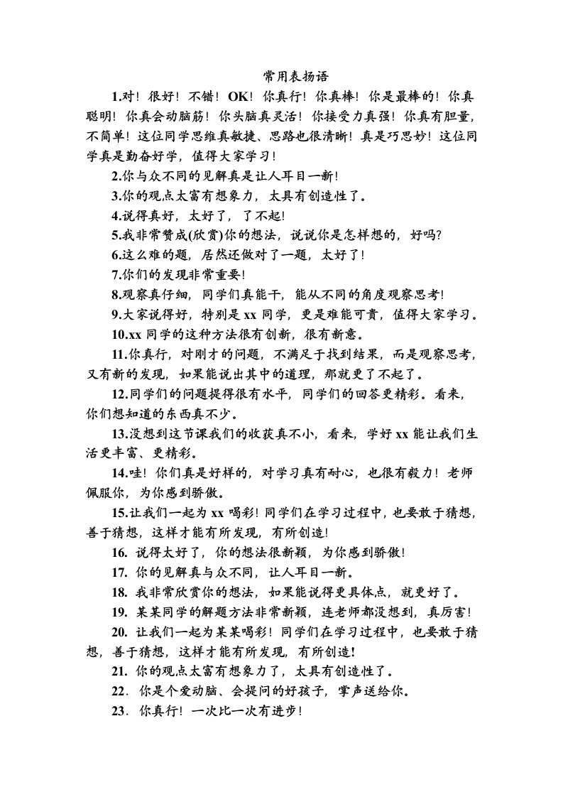 常用表扬语1对!很好!不错!OK!你真行!你真棒!你是最棒的!你真聪明!你真会动脑筋!你头脑真灵活!你接受力真强!你真有胆量,不简单!这位同学思维真敏捷、思路也很清晰!真是巧思妙!这位同学真是勤奋好学,值得大家学习」2.你与众不同的见解真是让人耳目一新!3.你的观,点太富有想象力,太具有创造性了。4.说得真好,太好了,了不起!5.我非常赞成(欣赏)你的想法,说说你是怎样想的,好吗?6这么难的题,居然还做对了一题,太好了!7.你们的发现非常重要!8观察真仔细,同学们真能干,能从不同的角度观察思考!9.大家说得好,特别是Xx同学,更是难能可责,值得大家学习。10xx同学的这种方法很有创新,很有新意。11.你真行,对刚才的问题,不满足于找到结果,而是观察思考,又有新的发现,如果能说出其中的道理,那就更了不起了。12.同学们的问题提得很有水平,同学们的回答更精彩。看来,你们想知道的东西真不少。13.没想到这节课我们的收获真不小,看来,学好Xx能让我们生活更丰富、更精彩。14.哇!你们真是好样的,对学习真有耐心,也很有毅力!老师佩服你,为你感到骄傲。15.让我们一起为XX喝彩!同学们在学习过程中,也要敢于猜想,善于猜想,这样才能有所发现,有所创造!16.说得太好了,你的想法很新颖,为你感到骄傲!17.你的见解真与众不同,让人耳目一新。18.我非常欣赏你的想法,如果能说得更具体,点,就更好了。19.某某同学的解题方法非常新颖,连老师都没想到,真厉害!20.让我们一起为某某喝彩!同学们在学习过程中,也要敢于猜想,善于猜想,这样才能有所发现,有所创造!21.你的观,点太富有想象力了,太具有创造性了。22.你是个爱动脑、会提问的好孩子,掌声送给你。23.你真行!一次比一次有进步!