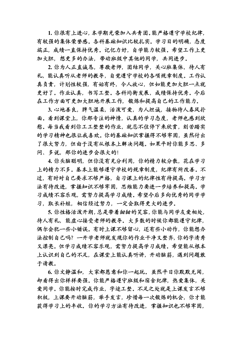 1.你很有上进心,本学期光荣加入共青团。能严格遵守学校纪律,有较强的集体荣誉感。各科基础知识比较扎实。学习目的明确,态度端正,成绩一直保持优秀。记忆力好,自学能力较强。希望工作上更加大胆,想更多的办法,带动班级中其他的同学,共同进步。2.你为人正直诚恳,尊敬老师,团结同学,关心班集体,待人有礼,能认真听从老师的教导,自觉遵守学校的各项规章制度。工作认真负责,计划性较强,有始有终,令人放心,但如能更加大胆一点就更好了。作业认真,书写工整。各科均衡发展,成绩保持优秀。今后在工作方面可更加大胆地开展工作,锻炼和提高自己的工作能力。3.心地善良,脾气温柔,活泼可爱,为人坦诚,接物待人春风扑面。看到课堂上,你那专注的神情,认真的学习态度,老师也感到欣慰。每当我看到你工工整整的作业,就忍不住停下来欣赏,刻苦踏实的学习精神也很让我喜欢。你的基础知识掌握得不够牢固,虽然付出了很大努力,但由于没有从根本上解决问题。如果平时你能多思、多问、多说,那你的进步会很大的!4.你头脑聪明,但你没有充分利用,你的精力较分散,花在学习上的精力不多。基本上能够遵守学校的规章制度,纪律有所改善。不过,有时对自己要求不够严格,自习课上的纪律性有待提高。学习方法有待改进,掌握知识不够牢固,思维能力要进一步培养和提高。学习成绩不容乐观,需努力提高学习成绩。希望今后多向优秀的同学学习,取长补短,相信经过努力,一定会取得更大的进步。5.你性格活泼开朗,总是带着甜甜的笑容,你能与同学友爱相处,待人有礼,能虚心接受老师的教导。大多数的时候你都能遵守纪律,偶尔会犯一些小错误。有时上课不够留心,还有些小动作,你能想办法控制自己吗?一开学老师就发现你的作业干净又整齐,你的字清秀又漂亮。但学习成绩不容乐观,需努力提高学习成绩。希望能从根本上认识到自己的不足,在课堂上能认真听讲,开动脑筋,遇到问题敢于请教。6.你文静温和,大家都愿意和你一起玩。虽然平日你默默无闻,却看得出你样样要强。你能严格遵守班级和宿舍纪律,热爱集体,关爱同学。你能按时完成作业,字迹工整。不足之处就是上课发言不够积极,上课要开动脑筋,举手发言,珍惜每一次锻炼的机会,你才能获得学习上的丰收。你的学习方法有待改进,掌握知识也不够牢固,