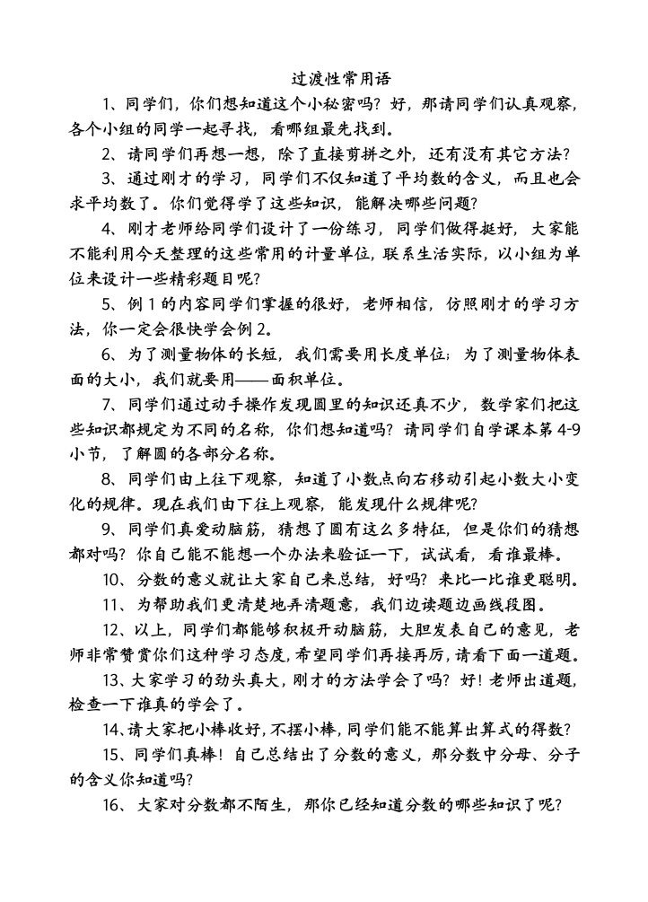 过渡性常用语1、同学们,你们想知道这个小秘密吗?好,那请同学们认真观察,各个小组的同学一起寻找,看哪组最先找到。2、请同学们再想一想,除了直接剪拼之外,还有没有其它方法?3、通过刚才的学习,同学们不仅知道了平均数的含义,而且也会求平均数了。你们觉得学了这些知识,能解决哪些问题?4、刚才老师给同学们设计了一份练习,同学们做得挺好,大家能不能利用今天整理的这些常用的计量单位,联系生活实际,以小组为单位来设计一些精彩题目呢?5、例1的内容同学们掌握的很好,老师相信,仿照刚才的学习方法,你一定会很快学会例2。6、为了测量物体的长短,我们需要用长度单位;为了测量物体表面的大小,我们就要用一面积单位。7、同学们通过动手操作发现圆里的知识还真不少,数学家们把这些知识都规定为不同的名称,你们想知道吗?请同学们自学课本第49小节,了解圆的各部分名称。8、同学们由上往下观察,知道了小数点向右移动引起小数大小变化的规律。现在我们由下往上观察,能发现什么规律呢?9、同学们真爱动脑筋,猜想了圆有这么多特征,但是你们的猜想都对吗?你自己能不能想一个办法来验证一下,试试看,看谁最棒。10、分数的意义就让大家自己来总结,好吗?来比一比谁更聪明。11、为帮助我们更清楚地弄清题意,我们边读题边画线段图.12、以上,同学们都能够积极开动脑筋,大胆发表自己的意见,老师非常赞赏你们这种学习态度,希望同学们再接再厉,请看下面一道题。13、大家学习的劲头真大,刚才的方法学会了吗?好!老师出道题,检查一下谁真的学会了。14、请大家把小棒收好,不摆小棒,同学们能不能算出算式的得数?15、同学们真棒!自己总结出了分数的意义,那分数中分母、分子的含义你知道吗?16、大家对分数都不陌生,那你已经知道分数的哪些知识了呢?