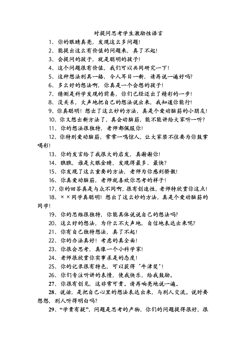 对提问思考学生激励性语言1、你的眼睛真亮,发现这么多问题!2、能提出这么有价值的问题来,真了不起!3、会提问的孩子,就是聪明的孩子!4、这个问题很有价值,我们可以共同研究一下!5、这种想法别具一格,令人耳目一新,请再说一遍好吗?6、多么好的想法啊,你真是一个会想的孩子!7、猜测是科学发现的前奏,你们已经迈出了精彩的一步」8、没关系,大声地把自己的想法说出来,我知道你能行」9、你真聪明!想出了这么妙的方法,真是个爱动脑筋的小朋友!10、你又想出新方法了,真会动脑筋,能不能讲给大家听一听?11、你的想法很独特,老师都佩服你!12、你特别爱动脑筋,常常一鸣惊人,让大家禁不住要为你鼓掌喝彩13、你的发言给了我很大的启发,真谢谢你!14、瞧瞧,谁是火眼金睛,发现得最多、最快?15、你发现了这么重要的方法,老师为你感到骄傲!16、你真爱动脑筋,老师就喜欢你思考的样子!17、你的回答真是与众不同啊,很有创造性,老师特欣赏你这,点!18、××同学真聪明!想出了这么妙的方法,真是个爱动脑筋的同学!19、你的思维很独特,你能具体说说自己的想法吗?20、这么好的想法,为什么不大声地、自信地表达出来呢?21、你有自己独特想法,真了不起!22、你的办法真好!考虑的真全面」23、你很会思考,真像一个小科学家」24、老师很欣赏你实事求是的态度!25、你的记录很有特色,可以获得“牛津奖”!26、你们专注听讲的表情,使我快乐,给我鼓励。27、你很有创见,这非常可责。请再响亮地说一遍。28、说话,是把自己心里的想法表达出来,与别人交流。说时要想想,别人听得明白吗?29、“学贵有疑”,问题是思考的产物,你们的问题提得很好,很