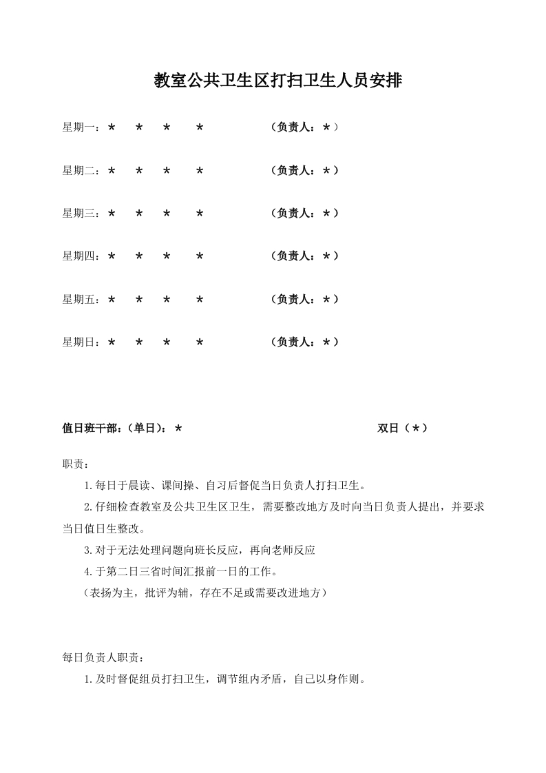 教室公共卫生区打扫卫生人员安排星期一:*大大(负责人:*)星期二:*(负责人:*)星期三:大大大*(负责人:*)星期四:大*(负责人:*)星期五:*(负责人:*)星期日:**大*(负责人:*)值日班干部:(单日):*双日(*)职责:1.每日于晨读、课间操、自习后督促当日负责人打扫卫生。2.仔细检查教室及公共卫生区卫生,需要整改地方及时向当日负责人提出,并要求当日值日生整改。3.对于无法处理问题向班长反应,再向老师反应4.于第二日三省时间汇报前一日的工作。(表扬为主,批评为辅,存在不足或需要改进地方)每日负责人职责:1.及时督促组员打扫卫生,调节组内矛盾,自己以身作则。