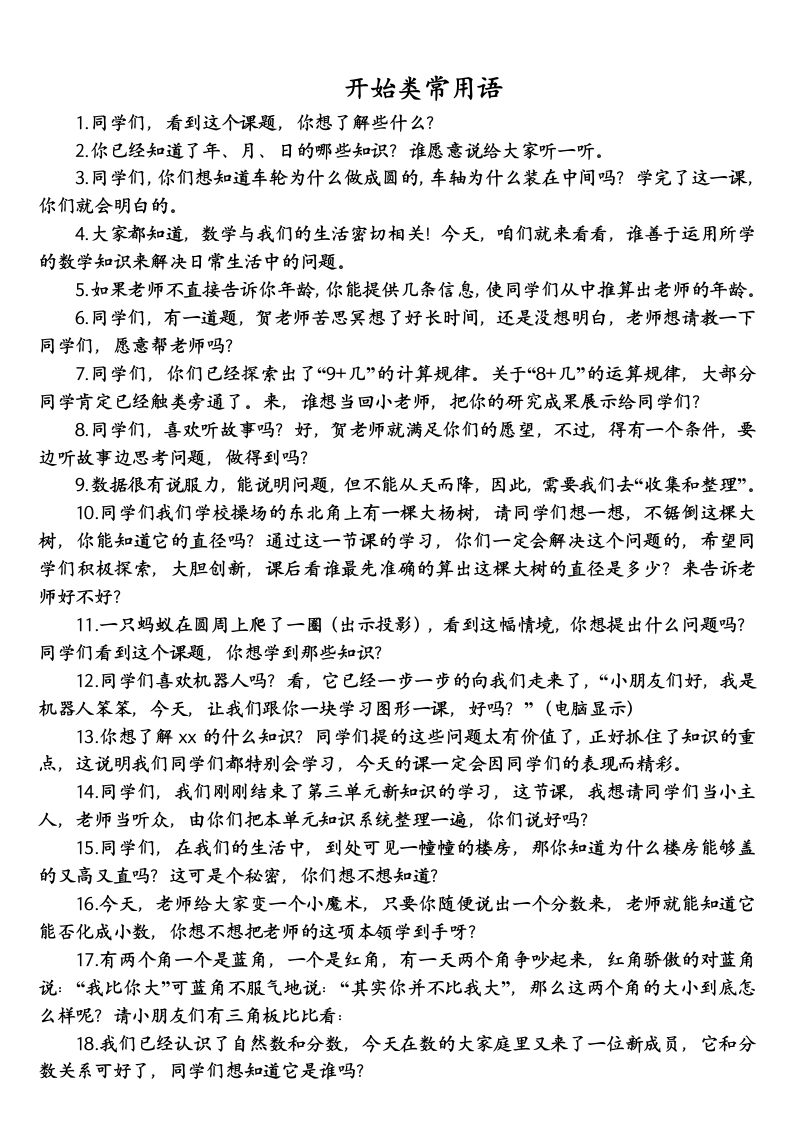 开始类常用语1.同学们,看到这个课题,你想了解些什么?2.你已经知道了年、月、日的哪些知识?谁愿意说给大家听一听。3.同学们,你们想知道车轮为什么做成圆的,车轴为什么装在中间吗?学完了这一课,你们就会明白的。4.大家都知道,数学与我们的生活密切相关!今天,咱们就来看看,谁善于运用所学的数学知识来解决日常生活中的问题。5.如果老师不直接告诉你年龄,你能提供几条信息,使同学们从中推算出老师的年龄。6同学们,有一道题,贺老师苦思冥想了好长时间,还是没想明白,老师想请教一下同学们,愿意帮老师吗?7.同学们,你们已经探索出了“9+几”的计算规律。关于“8+几”的运算规律,大部分同学肯定已经触类旁通了。来,谁想当回小老师,把你的研究成果展示给同学们?8.同学们,喜欢听故事吗?好,贺老师就满足你们的愿望,不过,得有一个条件,要边听故事边思考问题,做得到吗?9数据很有说服力,能说明问题,但不能从天而降,因此,需要我们去“收集和整理”10同学们我们学校操场的东北角上有一棵大杨树,请同学们想一想,不锯倒这棵大树,你能知道它的直径吗?通过这一节课的学习,你们一定会解决这个问题的,希望同学们积极探索,大胆创新,课后看谁最先准确的算出这棵大树的直径是多少?来告诉老师好不好?11.一只蚂蚁在圆周上爬了一圈(出示投影),看到这幅情境,你想提出什么问题吗?同学们看到这个课题,你想学到那些知识?12.同学们喜欢机器人吗?看,它已经一步一步的向我们走来了,“小朋友们好,我是机器人笨笨,今天,让我们跟你一块学习图形一课,好吗?”(电脑显示)13.你想了解Xx的什么知识?同学们提的这些问题太有价值了,正好抓住了知识的重点,这说明我们同学们都特别会学习,今天的课一定会因同学们的表现而精彩。14.同学们,我们刚刚结束了第三单元新知识的学习,这节课,我想请同学们当小主人,老师当听众,由你们把本单元知识系统整理一遍,你们说好吗?15.同学们,在我们的生活中,到处可见一幢幢的楼房,那你知道为什么楼房能够盖的又高又直吗?这可是个秘密,你们想不想知道?16.今天,老师给大家变一个小魔术,只要你随便说出一个分数来,老师就能知道它能否化成小数,你想不想把老师的这项本领学到手呀?17有两个角一个是蓝角,一个是红角,有一天两个角争妙起来,红角骄傲的对蓝角说:“我比你大”可蓝角不服气地说:“其实你并不比我大”,那么这两个角的大小到底怎么样呢?请小朋友们有三角板比比看:18.我们已经认识了自然数和分数,今天在数的大家庭里又来了一位新成员,它和分数关系可好了,同学们想知道它是谁吗?