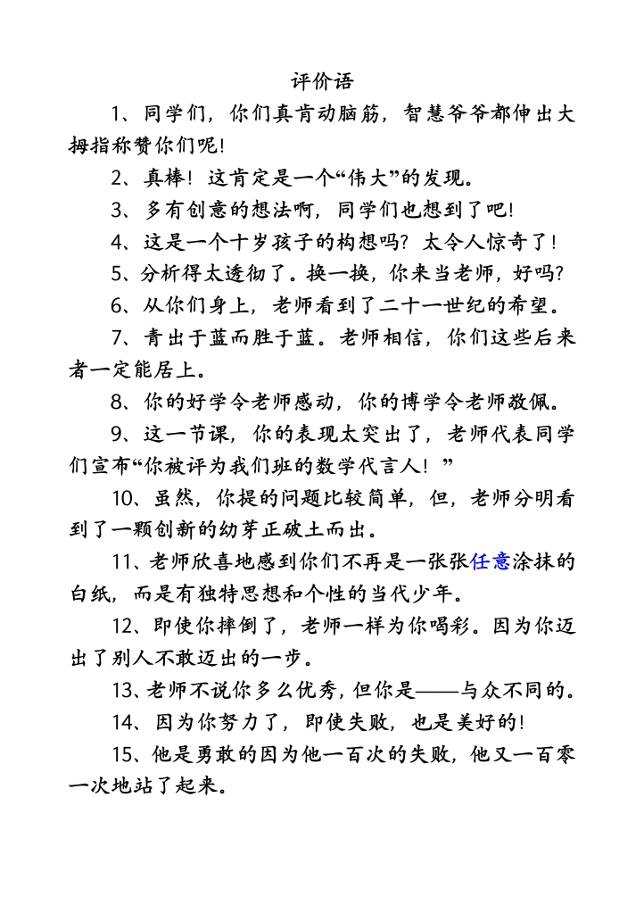 评价语1、同学们,你们真肯动脑筋,智慧爷爷都伸出大拇指称赞你们呢!2、真棒!这肯定是一个“伟大”的发现。3、多有创意的想法啊,同学们也想到了吧」4、这是一个十岁孩子的构想吗?太令人惊奇了」5、分析得太透彻了。换一换,你来当老师,好吗?6、从你们身上,老师看到了二十一世纪的希望。7、青出于蓝而胜于蓝。老师相信,你们这些后来者一定能居上。8、你的好学令老师感动,你的博学令老师敬佩。9、这一节课,你的表现太突出了,老师代表同学们宣布“你被评为我们班的数学代言人!”10、虽然,你提的问题比较简单,但,老师分明看到了一颗创新的幼芽正破土而出。11、老师欣喜地感到你们不再是一张张任意涂抹的白纸,而是有独特思想和个性的当代少年。12、即使你摔倒了,老师一样为你喝彩。因为你迈出了别人不敢迈出的一步。13、老师不说你多么优秀,但你是一与众不同的。14、因为你努力了,即使失败,也是美好的!15、他是勇敢的因为他一百次的失败,他又一百零一次地站了起来。